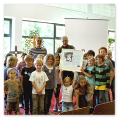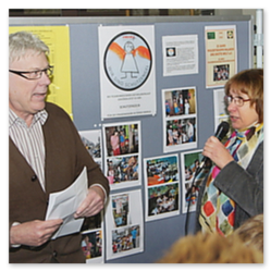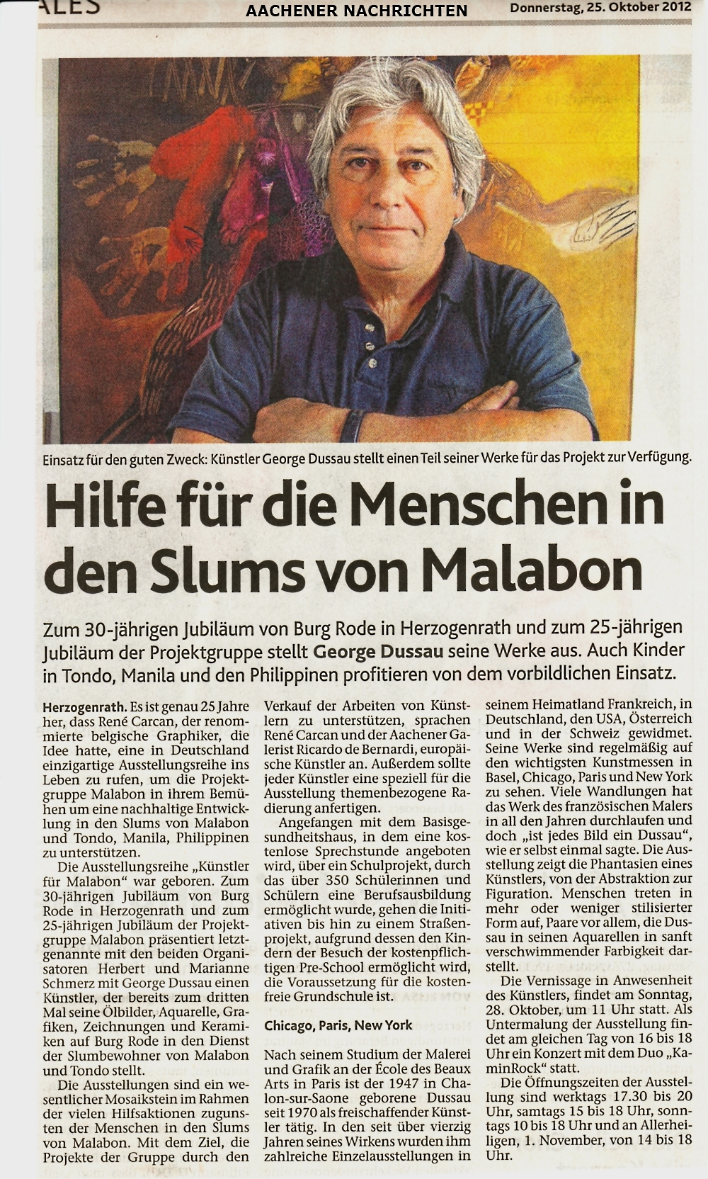 Der 19.Sept. war ein besonderer Tag für die Projektgruppe Malabon. Wir konnten den höchst interessierten Zuhörern (unter ihnen als Schirmherr der Veranstaltung Bürgermeister W. Jungnitsch) nicht nur über unsere 25jährige Arbeit in den Slums von Malabon, Tondo und Tubigon (Bohol) berichten, wir erhielten von Frau Reermann von missio anlässlich unseres Jubiläums als Anerkennung unserer Arbeit für die Straßenkinder aus Tondo dieses Schutzengel-Schild.Es zeigt Annie, den Schutzengel mit dem gebrochenen Flügel. Annie steht als Symbol für die engagierte und erfolgreiche Kinderrechts-kampagne von PREDA (s. www.preda.org/) mit ihrem Leiter Pater Shay Cullan mit Partnern wie der FairHandelsgesellschaft dwp und missio. Ziel ist es, eine lebenswerte Zukunft für philippinische Kinder zu schaffen - frei von sexueller Ausbeutung, Gewalt und Armut.