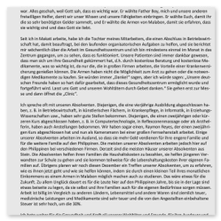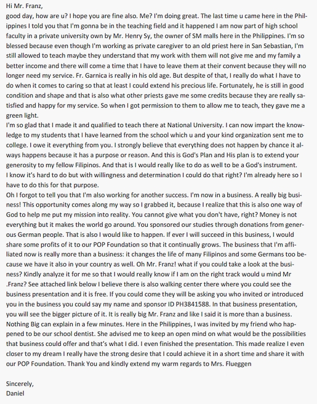 Guten Tag Mr. Franz, ich bin Vanessa Racelis, ehemalige Schülerin der POP FOUNDATION (Anm.: Partner der Projektgruppe Malabon) von 1995-1999 und habe einen Bachelor Abschluss für das höhere Lehramt in Geschichte. Ich war wirklich begeistert, euer Video zu sehen. Ich vermisse diese Stiftung so sehr. Ich erin-nere mich an die samstäglichen Treffen mit Sis. Dina und Bro. Apen und allen Schülern. Ich vermisse sie so sehr. Ich schätze mich so glücklich, weil ich mit Hilfe der POP Foundation das Studium beenden konnte. Danach habe ich ein Jahr lang als Lehrerin High School Schüler an der Arellano Universität in Mandaluyong, Metro Manila, unterrichtet. Anschließend habe ich jahrelang in einem internationalen Call-Center gearbeitet. Gegenwärtig arbeite ich als Pflegerin hier in Taiwan und plane, mich für einen Job in Kanada zu bewerben. Diese Stiftung ist eine große Hilfe für mich, weil man mit einem College-Abschluss viel leichter einen gut bezahlten Job auf den Philippinen finden kann. Jetzt kann ich meiner Familie helfen, meine verwitwete Schwester mit einem Geldbetrag unterstützen, um ihre 3 Kinder großzuziehen und sie in die Schule zu schicken (zwei zur Grundschule und eins zur High School). Ich weiß, dass mein College Abschluss nichts mit meinem gegenwärtigen Beruf zu tun hat, aber mein Job ist eine große Hilfe für meine Familie. Dank an alle Wohltäter, die den armen philippinischen Familien helfen. Ich hoffe, dass die POP FOUNDATION nie aufhört, nie müde wird, armen Familien zu helfen eines Tages in der Zukunft ein besseres Leben zu haben. Ich bete zu Gott euch Kraft zu geben, euch zu segnen, besonders den deutschen Partnern der POP FOUNDATUION, viel Glück. ICH LIEBE POP FOUNGATION. Ich bin's Vanessa Racelis. ...