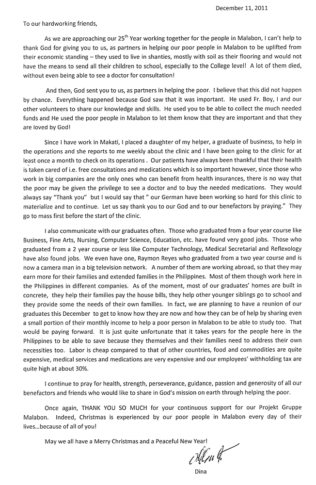 Am 07.01.2012 erreicht uns der nebenstehende Weihnachts-brief unserer Mitstreiterin der ersten Stunde Dina Santos, ge-nannt Sis. Dina, die jahrelang für die "Clinic" verantwortlich war und auch heute noch wenigstens einmal im Monat vorbeischaut, um alle Vorgänge zu kontrollieren.