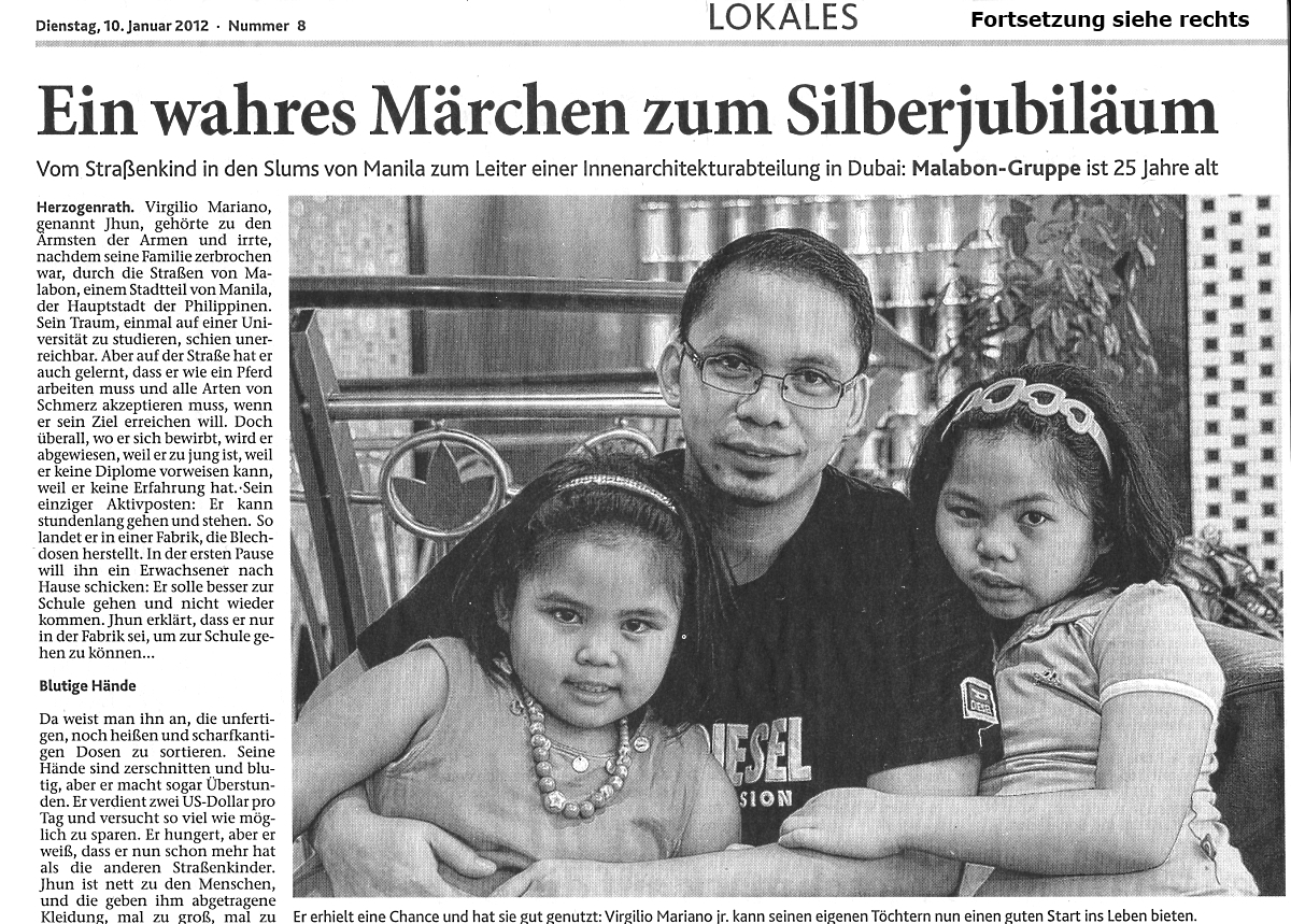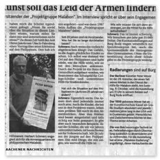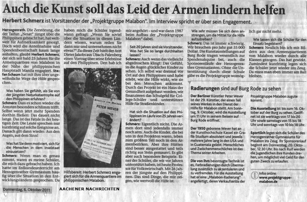 Jetzt überreichte ihnen Herbert Schmerz, Vorsitzender der Projektgruppe, als Anerkennung für ihr Enga-gement ein Bild eines ehemaligen Straßenkindes und einen Dankesbrief des philippinischen Priesters und Partner des Projekts, Father Boy. Denn, so H. Schmerz, "nach fast 25 Jahren Arbeit in den Slums von Malabon und Tondo ist es schwierig, dass Malabon-Projekt in den Köpfen der Menschen aus unserer Regi-on wach zu halten. Ihr tragt mit Eurem Engagement mit dazu bei, dass dies in Herzogenrath geschieht".Er konnte erzählen, dass die Gruppe erst kürzlich die höchst erfreuliche Nachricht erhalten habe, dass ein Kind aus dem Straßenkinder-Programm, Mary Grace, sogar Klassenbeste im ersten Grundschuljahr ge-worden sei. "Ohne solche Spenden wie die Eure hätte Mary Grace vermutlich nicht einmal die Chance gehabt überhaupt eine Schule zu besuchen. Mary Grace hat noch sieben Geschwister und Ihr Vater hat es schwer das Lebensnotwendige für seine Familie zu verdienen. In solchen Familien müssen die Kinder häufig durch Arbeiten zum Familieneinkommen beitragen. Häufig versuchen sie auf den Straßen Dienste zu leisten, für die sie ein wenig Geld bekommen oder zu betteln, vielleicht manchmal auch aus Not zu stehlen. Aufgrund ihrer Not geraten sie auch leicht an Menschen, die sie ausnutzen wollen oder gar zu Verbrechen anstiften."Solche Kinder von der Straße zu holen und ihnen eine Vorbereitung auf die Grundschule zu geben, damit sie dort überhaupt mithalten können, hat sich das Straßenkinderprojekt der "Projektgruppe Malabon und Dritte Welt e. V." zur Aufgabe gemacht, führt H. Schmerz weiter aus. Dazu gehöre aber auch, dass die Kinder im Straßenkinder-Programm täglich eine Mahlzeit bekommen und das ist keine Selbstverständ-lichkeit für sie. Jetzt sorgen ein paar kleine Leutchen in Kohlscheid dafür, dass ein Kind ein Jahr lang eine warme Mahlzeit bekommt.Seit dem Jahr 2003 betreut die Projektgruppe Malabon und Dritte Welt e.V. neben der 'Clinic', die den Armen schon seit mehr als zwei Jahrzehnten die Möglichkeit einer kostenlosen ärztlichen Behandlung bietet, und dem Schulprojekt (wir berichteten mehrfach) auch etwa 40 Straßenkinder, um diese auf die Schule vorzubereiten und ihnen einmal pro Tag eine warme Mahlzeit zukommen zu lassen.Die Nachricht über Mary Grace erfüllt die Mitglieder der Projektgruppe mit besonderem Stolz und beson-derer Freude, zeigt sie doch, dass ihre Arbeit keineswegs umsonst ist. Und das für Kinder, die ohne diese Hilfe keinerlei Chance hätten, ein menschenwürdiges Leben zu führen! Allerdings sollte nicht vergessen werden, dass die Fortführung dieser Arbeit nur mit Unterstützung möglichst vieler Freunde und Förderer möglich ist.Wie das geschehen kann, lässt sich der neu gestalteten und äußerst informativen Homepage unter www.projektgruppe-malabon.de leicht entnehmen. Sei es, dass man einmalig eine Spende erteilen oder Mitglied oder Pate werden möchte; sei es, dass man sein Unternehmen gegen einen geringen Betrag auf der Homepage als Sponsor eintragen lassen möchte.