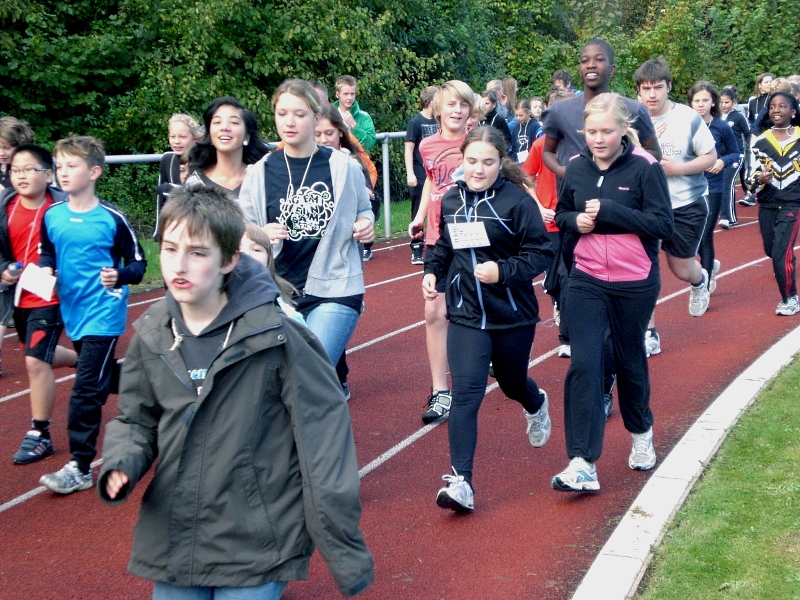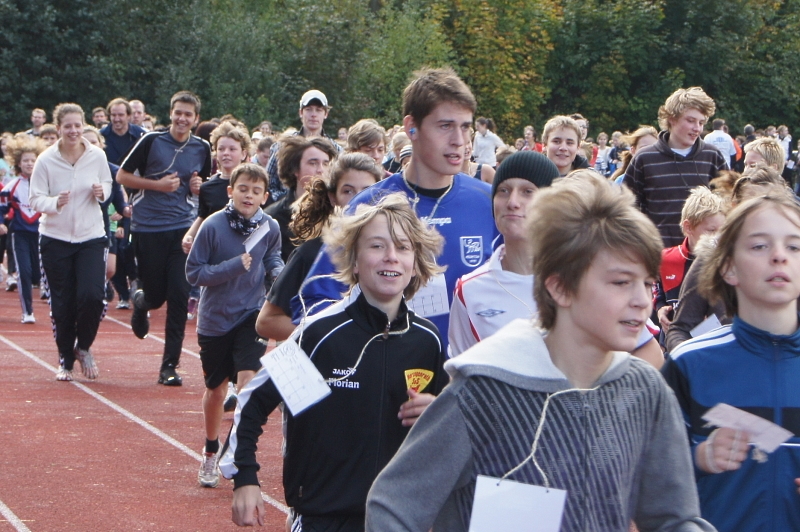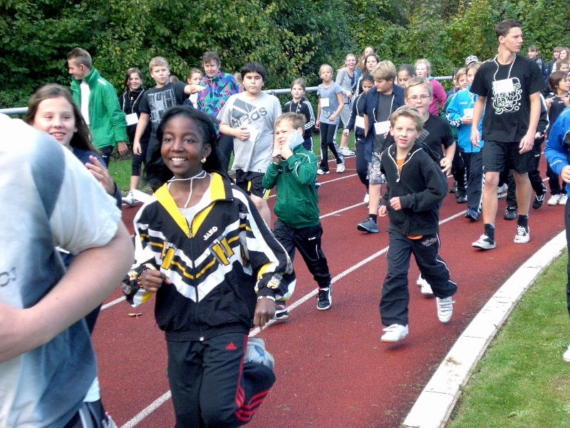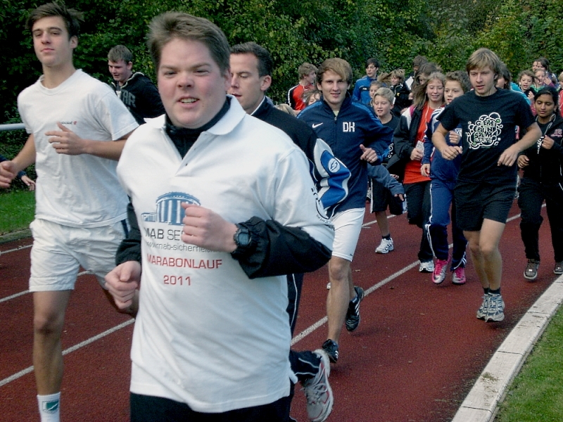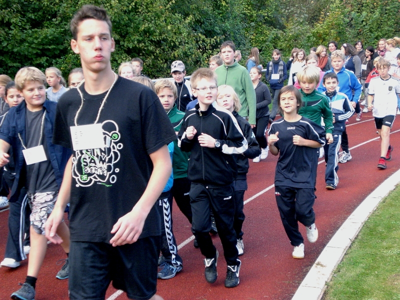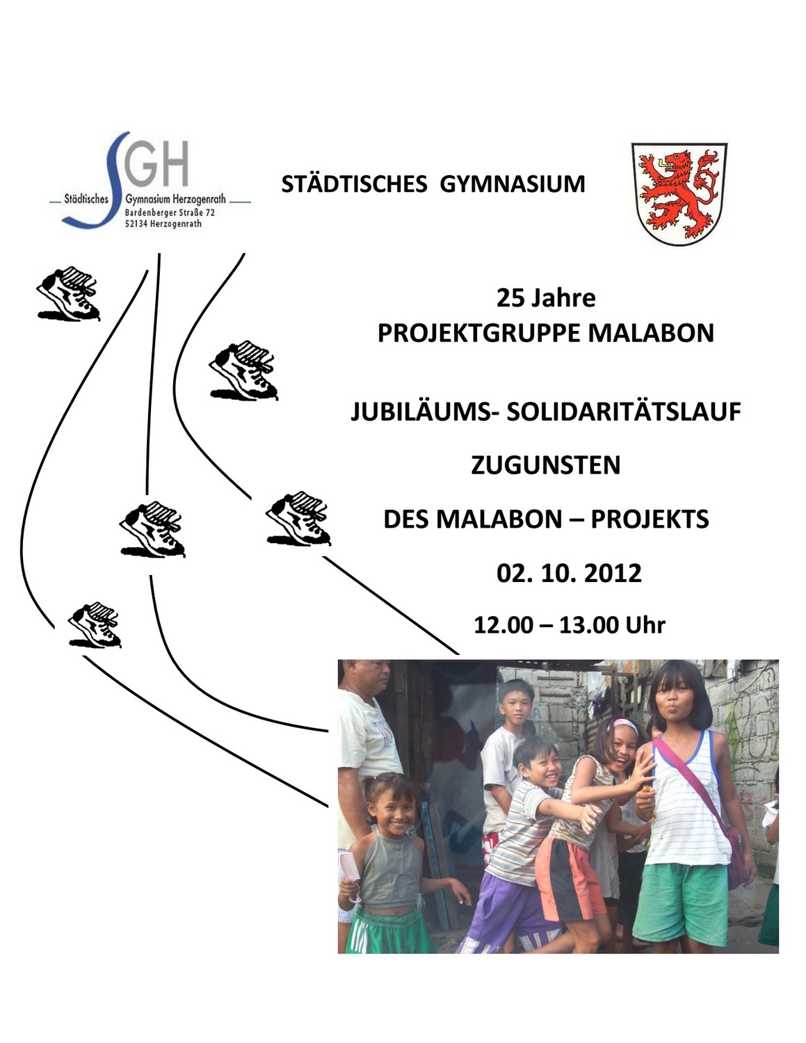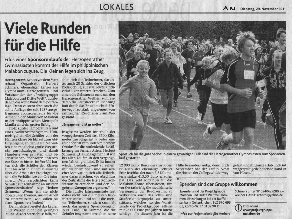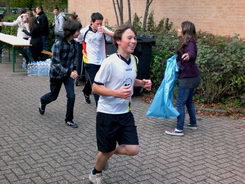 20.10.2011Am Städtischen Gymnasium findet in der 6. Stunde kein Unterricht statt. 434 Schüler-Innen, Lehrer und Eltern engagieren sich stattdessen beim 8. Malabonlauf für unsere Projekte. Darunter Fritz Jesch-ke, ehemaliger Schüler, der sein eigenes Kamerateam mitbrachte, um seinen tollen Einsatz zu filmen. Über 400€ Sponsorengelder sammelte er, um unsere Projekte zu unter-stützen.