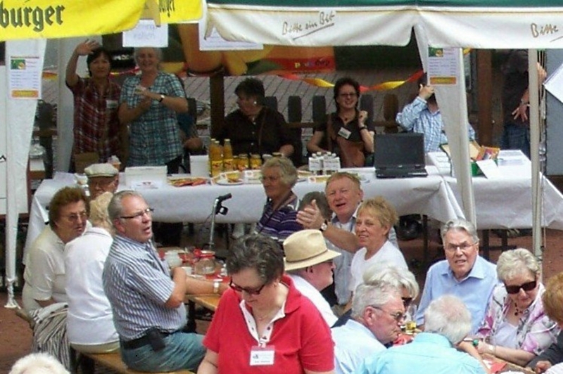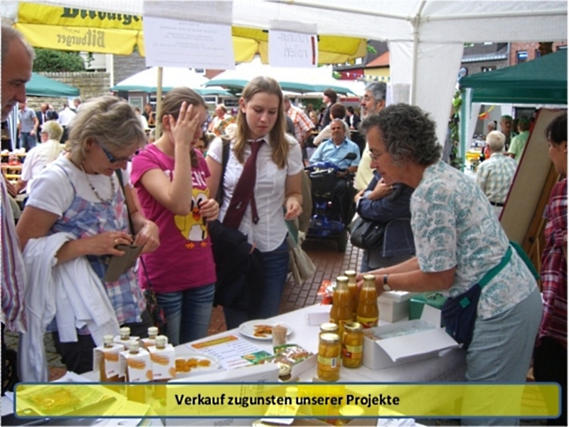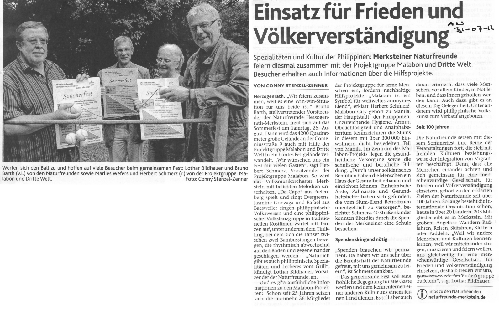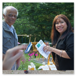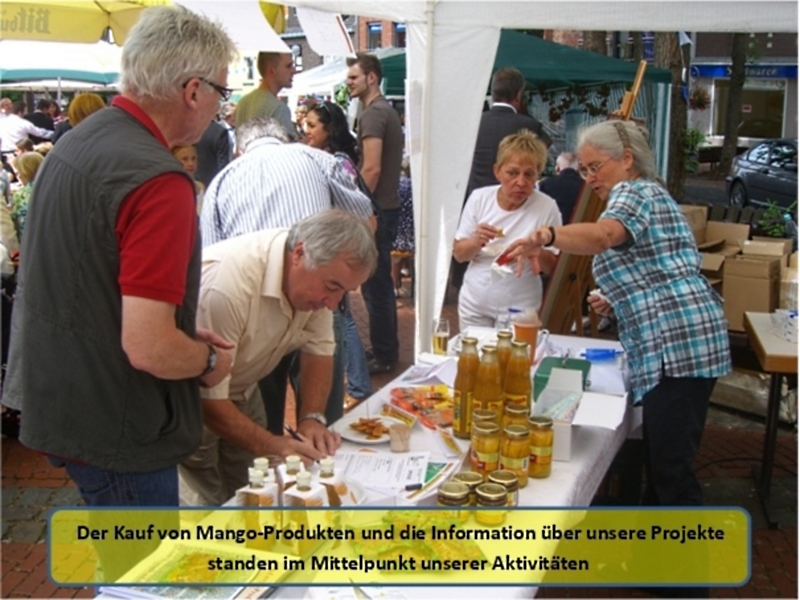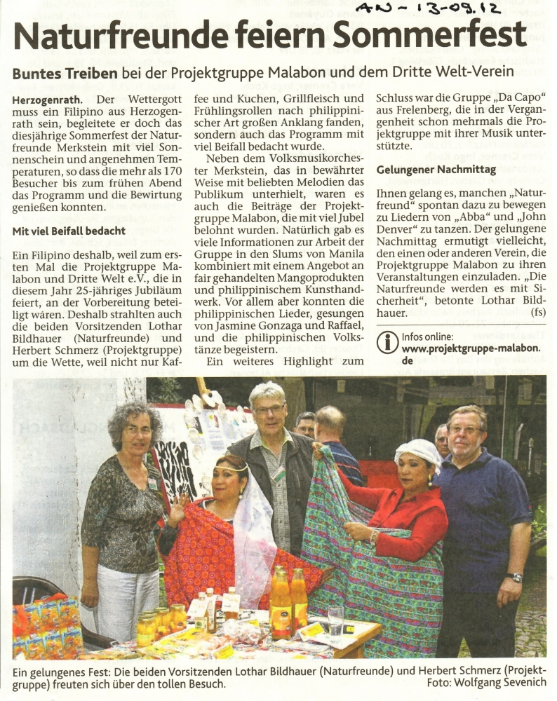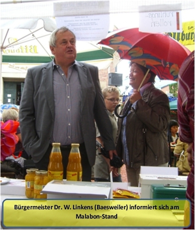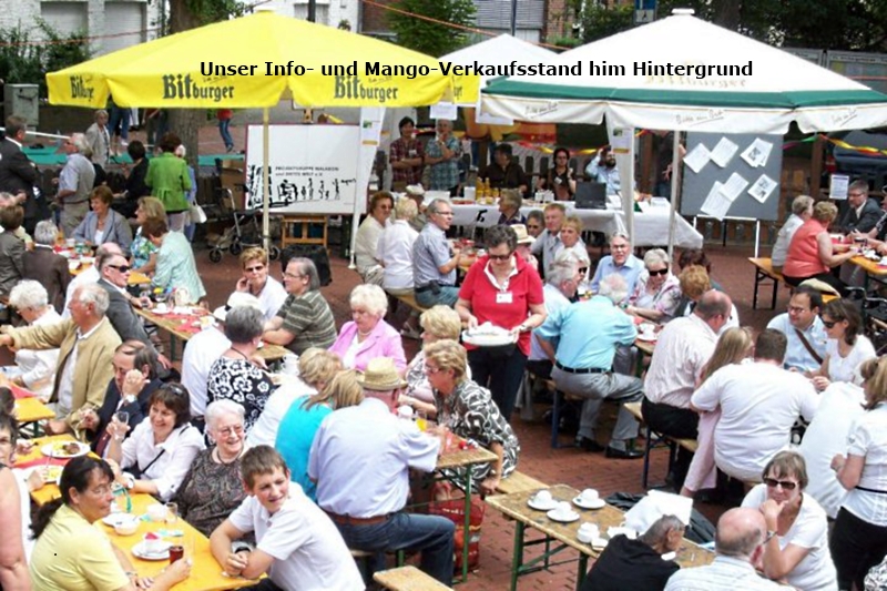 10.07.2011Herzlich aufgenommen!Wie schon 2007 hatten wir auch in diesem Jahr die Gelegenheit, uns am Pfarrfest St. Petrus Baesweiler mit einem eigenen Stand beteili-gen zu dürfen.Wir hatten das Gefühl, auf dieser Veranstaltung, die trotz des teil-weise etwas durchwachsenen Wetters hervorragend gut besucht war, herzlich willkommen zu sein.Netnet und Franz Flüggen, der auch maßgeblich an der Planung und Durchführung des Pfarrfestes beteiligt war, Norbert und Angelika Iskam, Herbert und Marianne Schmerz, Jürgen Dreschers, Alice Steinberg, Sofie Sequeira sowie Marlies und Dieter Wefers vertraten unsere Gruppe; Information über unsere Projekte und der Verkauf von Mango-Produkten, von philippinischen Kooperativen erzeugt, standen im Mittelpunkt unserer Aktion.Ein besonders Lob gilt dem Engagement von Netnet, die in „Heimar-beit“ 160 (!) Frühlingsrollen nach philippinischer Art einschließlich süßsaurer und scharfer Soße hergestellt hatte, die auf dem Fest - frisch frittiert - den Besuchern angeboten werden konnten. Ein wahrer Genuss!Als besondere Wertschätzung möchten wir hervorheben, dass der Baesweiler Bürgermeister Dr. Willi Linkens unserem Stand einen kurzen Besuch abstattete und sich über unsere Arbeit informieren ließ. Das lässt die Hoffnung aufkeimen, dass diese Veranstaltung nicht unsere letzte in Baesweiler war. Auch an eine Intensivierung der Sponsorenwerbung sollte gedacht werden.