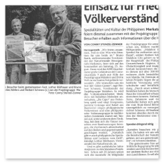 Zur Nachahmung empfohlenKinder der evangelischen Luthergemeinde Kohlscheid übernehmen PatenschaftHerzogenrath. Die Eltern hatten ihnen von der Arbeit der Projekt-gruppe Malabon in Manila auf den Philippinen erzählt, von den 40 Straßenkindern, die jetzt die Möglichkeit haben, den Kindergarten und damit die Vorschule zu besuchen. Keine Selbstverständlichkeit, ist doch der Kindergarten sehr teuer und das Geld von den philip-pinischen Eltern nicht aufzubringen. Spontan entschlossen sich die Jungen und Mädchen während der Kinderkirche Geld zu sammeln, um die Patenschaft für ein Straßenkind zu übernehmen. ....(Fortsetzung nächste Zeile)