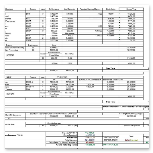 e-mail von Fr. Boy (27.05.2015)Hi Herbert,Tnx for the email, attached here is the Fin Statement.Of the proposed 250k for 10 trainings for Maribojoc projects, we made only 2 trainings. This year we will continue to target 10 trainings, we have finalized for implementation of 3 trainings for this quarter (June July August). Trainings take only 4 days to 2 weeks depending on the program of the instructors. We need to consider the number of 25 pax per training and the availability of instruc-tors.We will add Bohol Scholars to make it 7. We are adding 2 scholars for Malabon in place of the graduates,I am looking for somebody who could replace Carol. I tried one of the mothers but she could not cope with the minimum standards I wish to see. We need somebody like Carol who was a good leader, a good manager, a selfless person, a mother to the children, a humble person who listens and who faithfully implements. Huh! what a qualification I am searching for,,,and that was in Carol, Am not losing hope though, there is a person out there...We will be featuring one successful former scholar a month for both Bohol and Malabon in Facebook. I will tag you as soon as it is up.Am sad to tell you that several shanties were recently burnt to the ground. One belonged to the husband and 4 children of Carol. They lost practically everything. The husband of Carol makes aluminum windows (analok), I am just thinking if we can buy him the tools he lost in the fire so he can help himself and his children.Regards and do take care.Fr BoyPS I will scan next email some receipts of the Schools and Medicines.(auf unsere Nachfrage nach den Ausbildungseinheiten auf Bohol antwortet er):(Anmerkung: nach der Erdbebenkatastrophe im Oktober 2013 und dem Taifun Yolanda/Haiyan im November 2013 konnte man dort nur verspätet und eingeschränkt mit der Ausbildung beginnen)Hallo Herbert,Von den vorgesehenen 250 Auszubildenden in 10 Schulungen für die Maribojoc Projekte haben wir nur 2 Einheiten (à 25 Auszubildende, s. Abrechnung) durchgeführt. In diesem Jahr werden wir 10 Schulungen durchführen; für dieses Quartal (Juni, Juli, August) haben wir die Durchführung von 3 Trainingseinheiten festgelegt. Die Schulungen finden nur an 4 Tagen bis 2 Wochen je nach Programm der Ausbilder statt. Wir müssen die Anzahl von 25 Personen pro Training und die Verfügbarkeit von Ausbildern berücksichtigen.(Nachfrage nach neuen Schülern)Wir fügen auf Bohol drei neue Schüler hinzu, so dass wir dann dort sieben haben. In Malabon werden wir die Graduierten durch zwei neue Schüler ersetzen.(Nachfrage nach den Straßenkindern nach dem Tod von Sis. Carol, s. unsere Homepage)Ich suche nach jemandem, der Carol ersetzen kann. Ich habe eine der Mütter ausprobiert, aber sie bewäl-tigte nicht einmal die von mir gewünschten Mindeststandards. Wir brauchen jemanden wie Carol, die eine gute Leiterin, eine gute Managerin, eine selbstlose Person, eine Mutter für die Kinder, ein bescheidener Mensch, der zuhört und der pflichtbewusst alles in die Tat umsetzt. Huh! was für eine Qualifikation suche ich ... und all das war in Carol. Verliere dennoch nicht die Hoffnung, dass es eine Person da draußen gibt...(Nachfrage nach Kontakten zu ehemaligen SchülerInnen)Wir werden jeden Monat eine(n) erfolgreiche(n) frühere(n) SchülerIn sowohl für Bohol als auch aus Malabon auf Facebook bringen. Ich werde dich informieren, sobald hier etwas erscheint.Ich bin sehr traurig, dir mitteilen zu müssen, dass mehrere Hütten vor kurzem komplett abgebrannt sind. Eine gehörte dem Mann und den 4 Kindern von Carol. Sie verloren praktisch alles. Der Ehemann von Carol stellt Aluminium-Fenster (analok) her. Ich denke daran, ihm die Werkzeuge, die er im Feuer verloren hat, zu kaufen, damit er sich selbst und seinen Kindern helfen kann.Grüße und pass auf dich auf.Fr BoyPS Ich werde für die nächste E-Mail einige Rechnungen der Schulen und für die Arzneimittel einscannen.