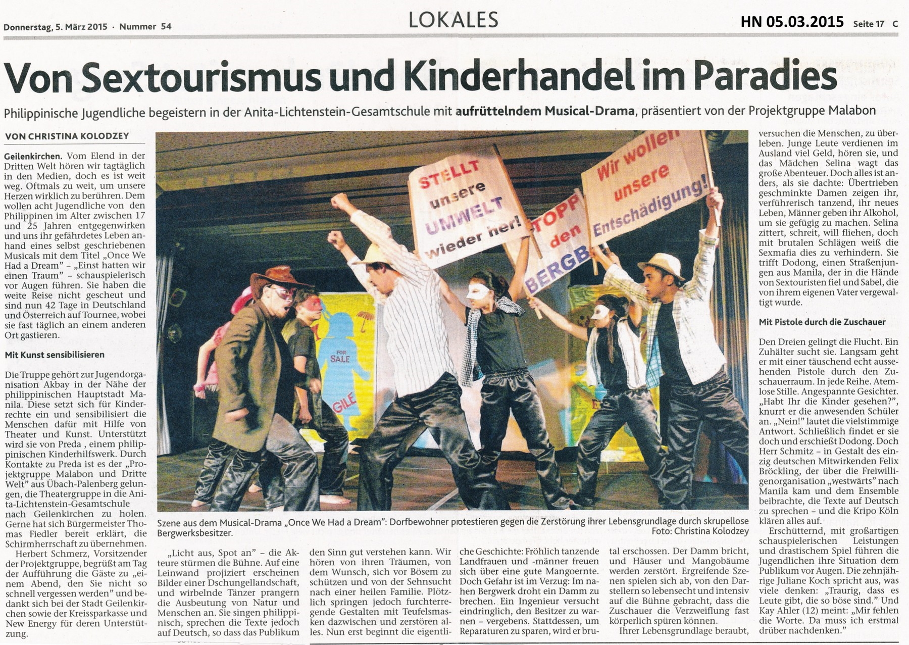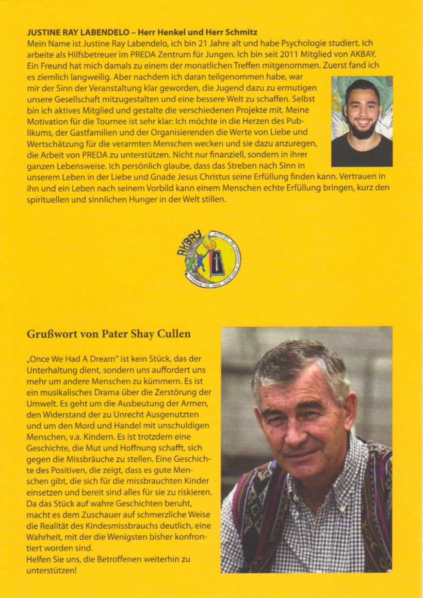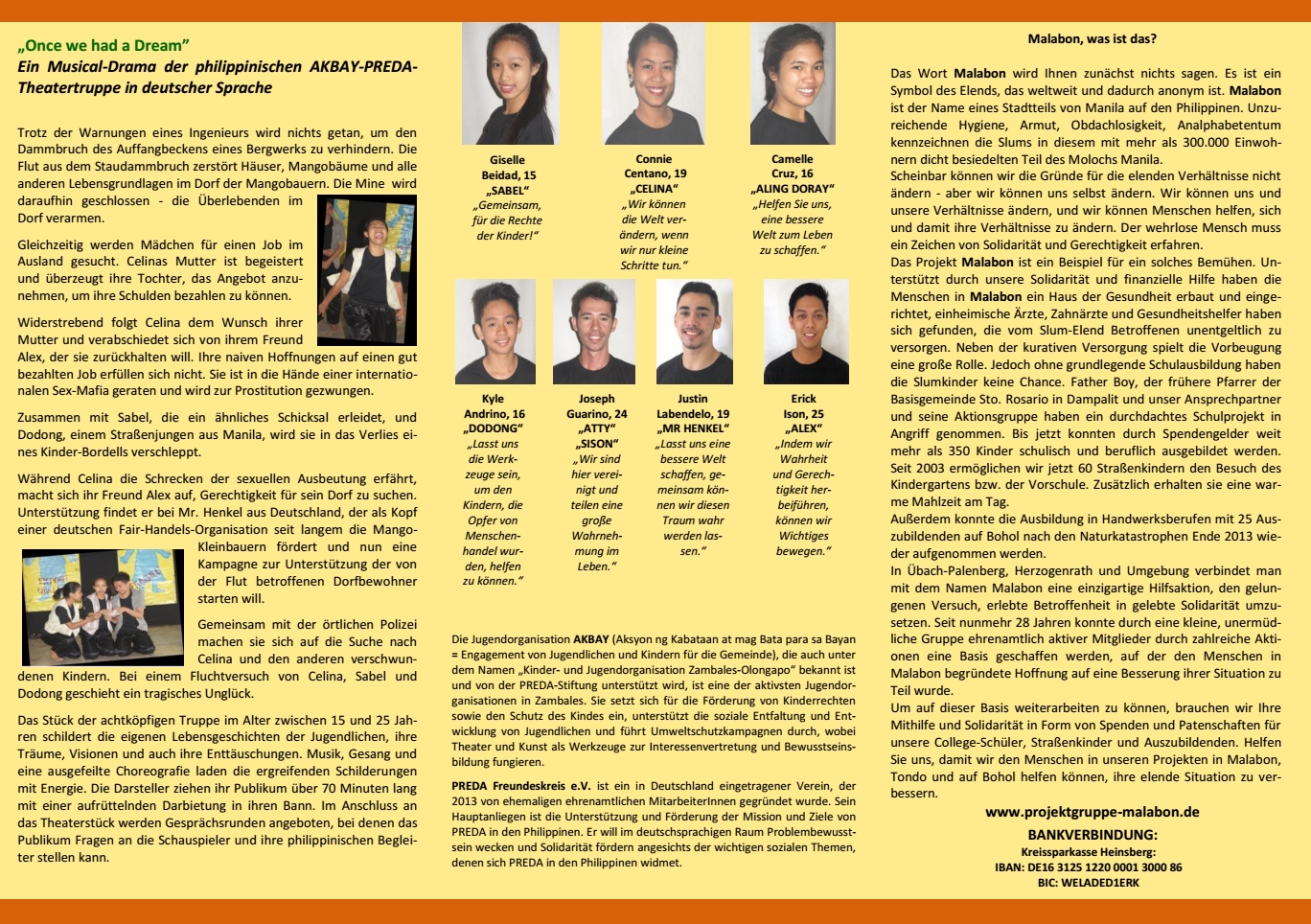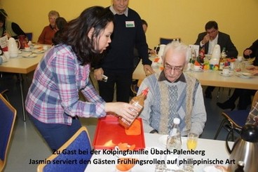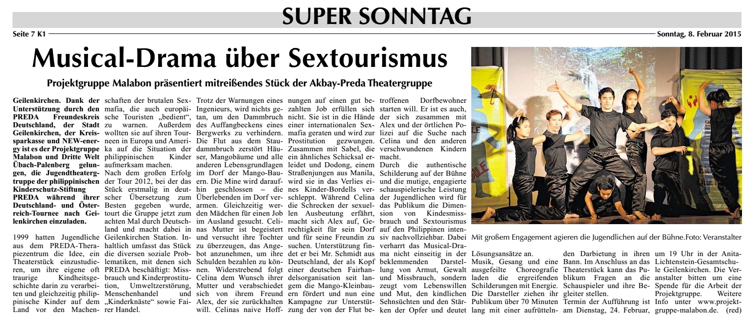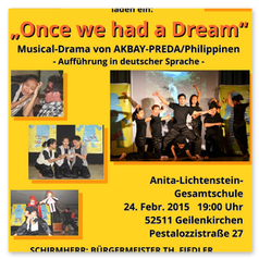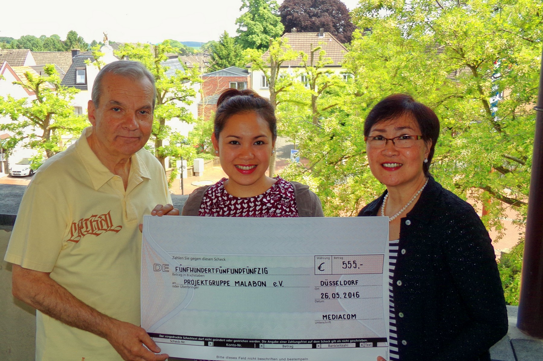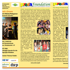 25-Jähriges im Mehrgenerationenhaus im alten Bahnhof Palenberg feiern. Unter den geladenen Gästen u.a. der Übach-Palenberger Bürgermeister W. Jungnitsch. Wir waren mit einer Infowand und dem Ver-kaufsstand für fair gehandelte Mangoprodukte vertreten. Als Hauptattraktion konnten wir allerdings philippinische Gesangseinlagen von Jasmine und Netnet Flüggen beisteuern sowie den Verkauf von Früh-lingsrollen auf philippinische Art, hergestellt von Netnet. Beides kam bei den überwiegend älteren Mit-gliedern der Kolpingfamilie offensichtlich sehr gut an! Bei Kaffee und reichlich leckerem Kuchen ergaben sich an den Tischen viele interessante Gesprächsrunden zwischen uns, als da waren Sofie, Franz, Netnet und Jasmin, Norbert Iskam, Herbert und Marianne, Alice, Marlies und Dieter, und den Mitgliedern der Kolpingfamilie. Längst verschüttet geglaubte Ereignisse, an denen sowohl Mitglieder der Projektgruppe als auch der Kolpingfamilie beteiligt waren, wurden zu neuem Leben erweckt. Wir danken der Kolpingfamilie für ihre Einladung!Tags darauf fanden wir (Herbert und Marianne, Hedi, Dieter) uns im Rathaus Übach-Palenberg ein. Rückblickend schaute Bürgermeister W. Jungnitsch noch einmal auf den am Tag zuvor erfolgten Besuch bei der Kolpingfamilie, nicht ohne darauf hinzuweisen, dass es zwischen der Arbeit der Projektgruppe und der der Kolpingfamilie nicht zu übersehende Parallelen gäbe. Dann folgte der eigentliche Anlass des Besu-ches: Die Scheckübergabe zum im Herbst erfolgten Benefizkonzert der Privat-Musikkapelle Scherpenseel in Zusammenwirken mit der Fanfare Victoria Rimburg zugunsten der Projektgruppe; Erlös: 1.640,41€!In Anwesenheit von Vertretern der beiden Musikgruppen konnten wir uns umgehend für dieses wunder-bare Ergebnis bedanken. Auch der Stadt Übach-Palenberg als Veranstalter sei an dieser Stelle noch ein-mal gedankt. Weitere Zusammenarbeit, u.U. auch in den benachbarten Niederlanden, nicht ausgeschlos-sen.Fernerhin wurde auch Thomas Gottschalk (nein, nicht der mit den blonden Locken und bunten Jacken) für sein Konzert auf Schloss Zweibrüggen zugunsten der Aktion "Unsere Kinder" mit einem Scheck bedacht. Beide, Th. Gottschalk und H. Schmerz, wurde Gelegenheit gegeben, über ihre Arbeit zu berichten. Weiterhin anwesend waren zwei hochrangige Vertreter der Bundeswehr, die nicht nur wiederholt Benefiz-Konzerte des Bundeswehr-Musikkorps in Übach-Palenberg mit verantworteten, sondern auch lebhaftes Interesse an der Arbeit der Projektgruppe erkennen ließen. Sogleich wurden Kontakte geknüpft, die darauf hinausliefen, vielleicht schon im kommenden Jahr unser Projekt bei geeigneter Gelegenheit (evtl. Tag der Offenen Tür) präsentieren zu können; besonderes Interesse wurde an einen Auftritt der PREDA-AKBAY-Theatergruppe, ggflls in englischer Sprache, bekundet. Mal sehen! Gleich drei Pressevertreter ließen die Hoffnung auf eine umfassende Darstellung in den regionalen Medien aufkommen.