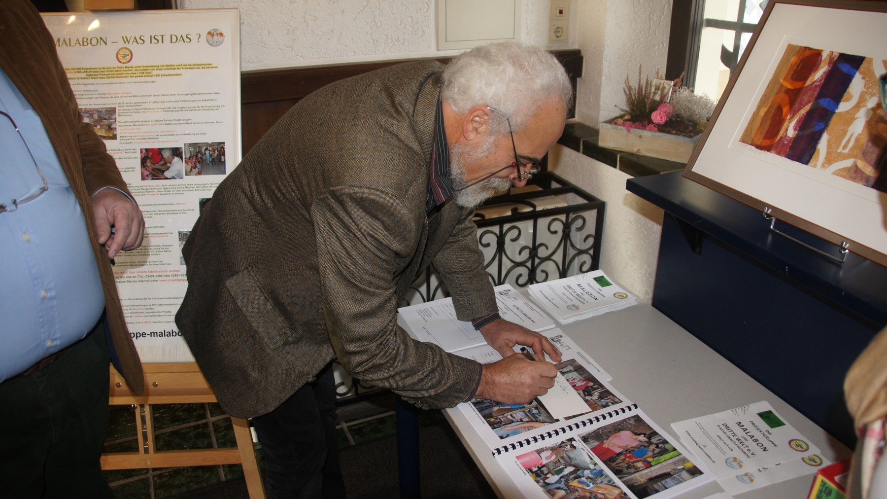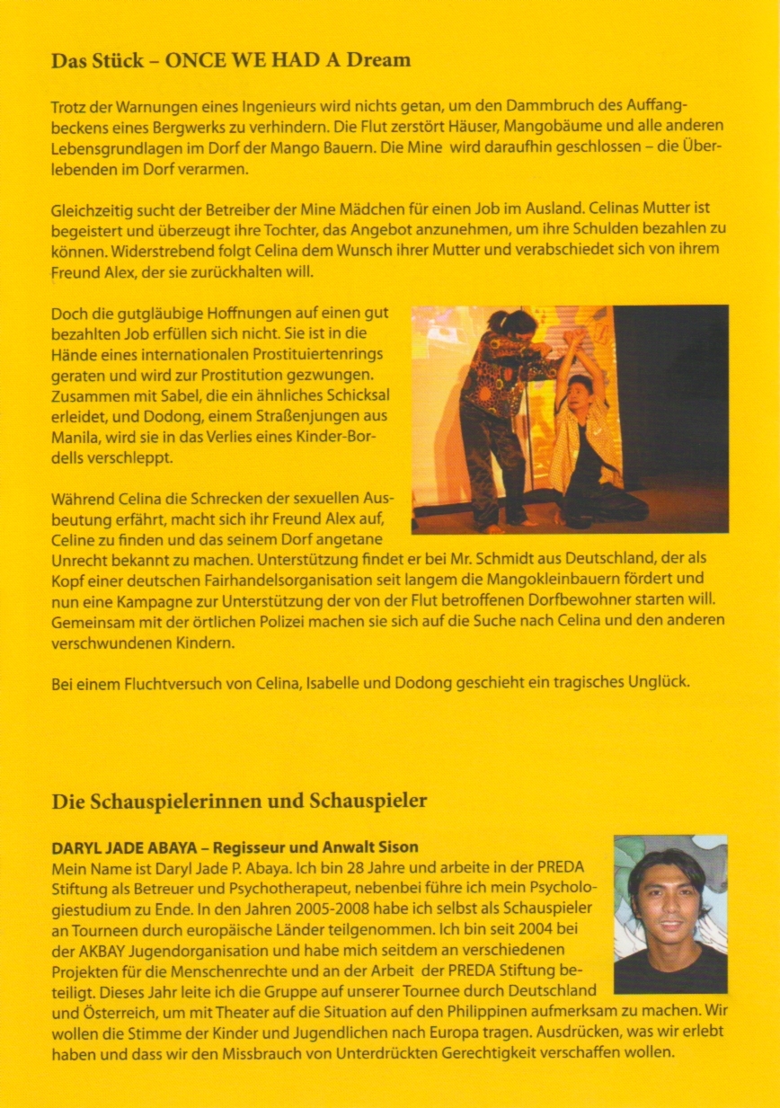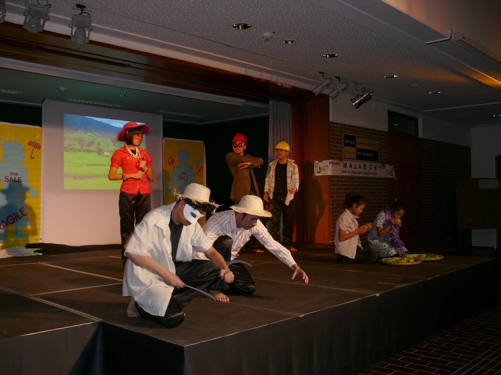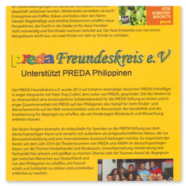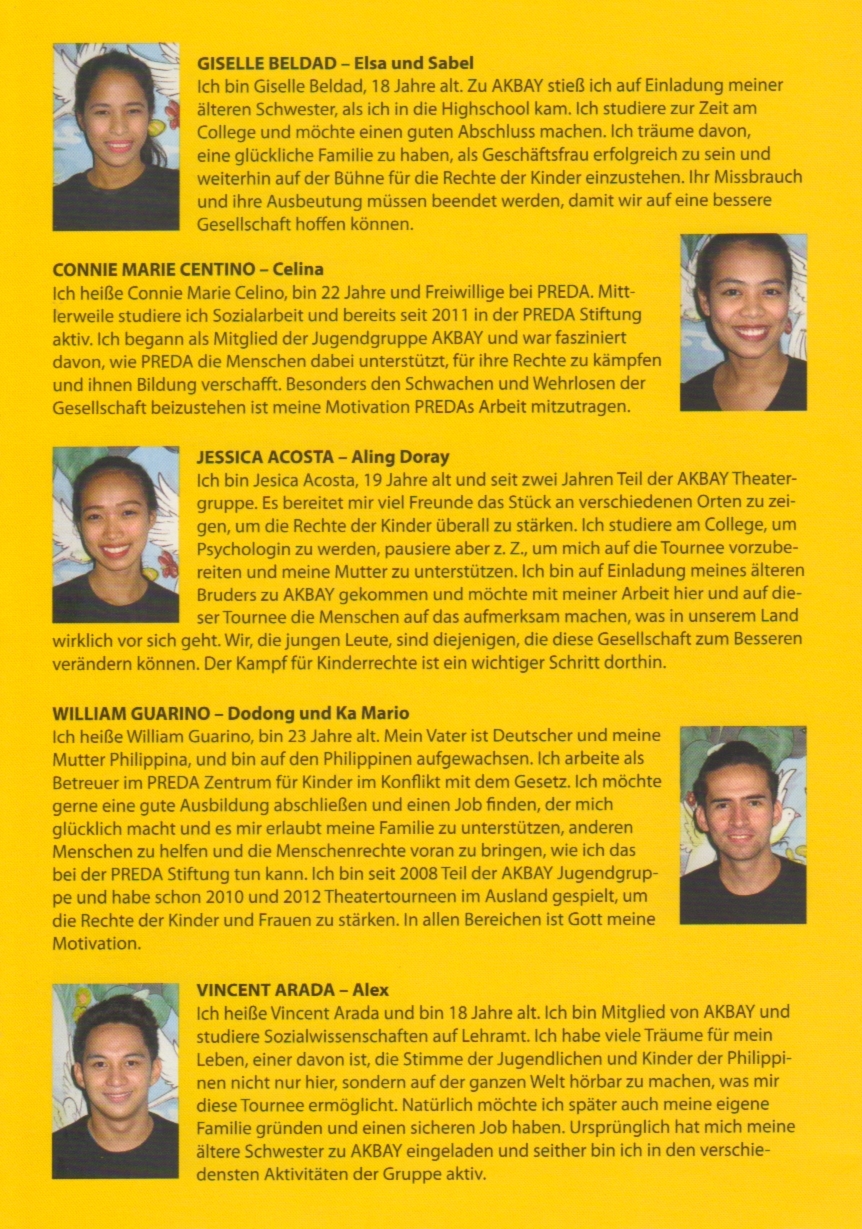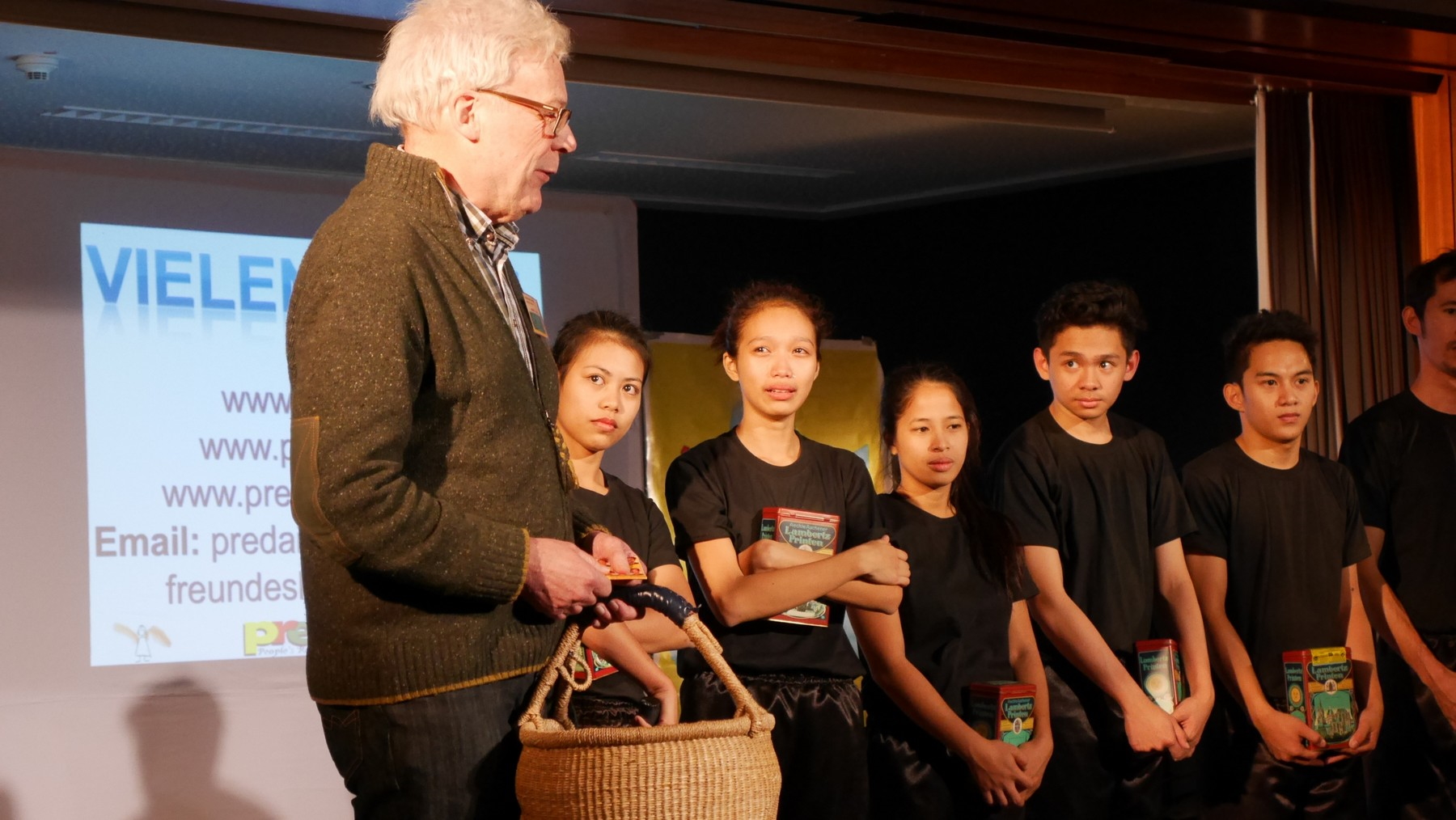 25-Jähriges im Mehrgenerationenhaus im alten Bahnhof Palenberg feiern. Unter den geladenen Gästen u.a. der Übach-Palenberger Bürgermeister W. Jungnitsch. Wir waren mit einer Infowand und dem Ver-kaufsstand für fair gehandelte Mangoprodukte vertreten. Als Hauptattraktion konnten wir allerdings philippinische Gesangseinlagen von Jasmine und Netnet Flüggen beisteuern sowie den Verkauf von Früh-lingsrollen auf philippinische Art, hergestellt von Netnet. Beides kam bei den überwiegend älteren Mit-gliedern der Kolpingfamilie offensichtlich sehr gut an! Bei Kaffee und reichlich leckerem Kuchen ergaben sich an den Tischen viele interessante Gesprächsrunden zwischen uns, als da waren Sofie, Franz, Netnet und Jasmin, Norbert Iskam, Herbert und Marianne, Alice, Marlies und Dieter, und den Mitgliedern der Kolpingfamilie. Längst verschüttet geglaubte Ereignisse, an denen sowohl Mitglieder der Projektgruppe als auch der Kolpingfamilie beteiligt waren, wurden zu neuem Leben erweckt. Wir danken der Kolpingfamilie für ihre Einladung!Tags darauf fanden wir (Herbert und Marianne, Hedi, Dieter) uns im Rathaus Übach-Palenberg ein. Rückblickend schaute Bürgermeister W. Jungnitsch noch einmal auf den am Tag zuvor erfolgten Besuch bei der Kolpingfamilie, nicht ohne darauf hinzuweisen, dass es zwischen der Arbeit der Projektgruppe und der der Kolpingfamilie nicht zu übersehende Parallelen gäbe. Dann folgte der eigentliche Anlass des Besu-ches: Die Scheckübergabe zum im Herbst erfolgten Benefizkonzert der Privat-Musikkapelle Scherpenseel in Zusammenwirken mit der Fanfare Victoria Rimburg zugunsten der Projektgruppe; Erlös: 1.640,41€!In Anwesenheit von Vertretern der beiden Musikgruppen konnten wir uns umgehend für dieses wunder-bare Ergebnis bedanken. Auch der Stadt Übach-Palenberg als Veranstalter sei an dieser Stelle noch ein-mal gedankt. Weitere Zusammenarbeit, u.U. auch in den benachbarten Niederlanden, nicht ausgeschlos-sen.Fernerhin wurde auch Thomas Gottschalk (nein, nicht der mit den blonden Locken und bunten Jacken) für sein Konzert auf Schloss Zweibrüggen zugunsten der Aktion "Unsere Kinder" mit einem Scheck bedacht. Beide, Th. Gottschalk und H. Schmerz, wurde Gelegenheit gegeben, über ihre Arbeit zu berichten. Weiterhin anwesend waren zwei hochrangige Vertreter der Bundeswehr, die nicht nur wiederholt Benefiz-Konzerte des Bundeswehr-Musikkorps in Übach-Palenberg mit verantworteten, sondern auch lebhaftes Interesse an der Arbeit der Projektgruppe erkennen ließen. Sogleich wurden Kontakte geknüpft, die darauf hinausliefen, vielleicht schon im kommenden Jahr unser Projekt bei geeigneter Gelegenheit (evtl. Tag der Offenen Tür) präsentieren zu können; besonderes Interesse wurde an einen Auftritt der PREDA-AKBAY-Theatergruppe, ggflls in englischer Sprache, bekundet. Mal sehen! Gleich drei Pressevertreter ließen die Hoffnung auf eine umfassende Darstellung in den regionalen Medien aufkommen.