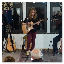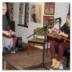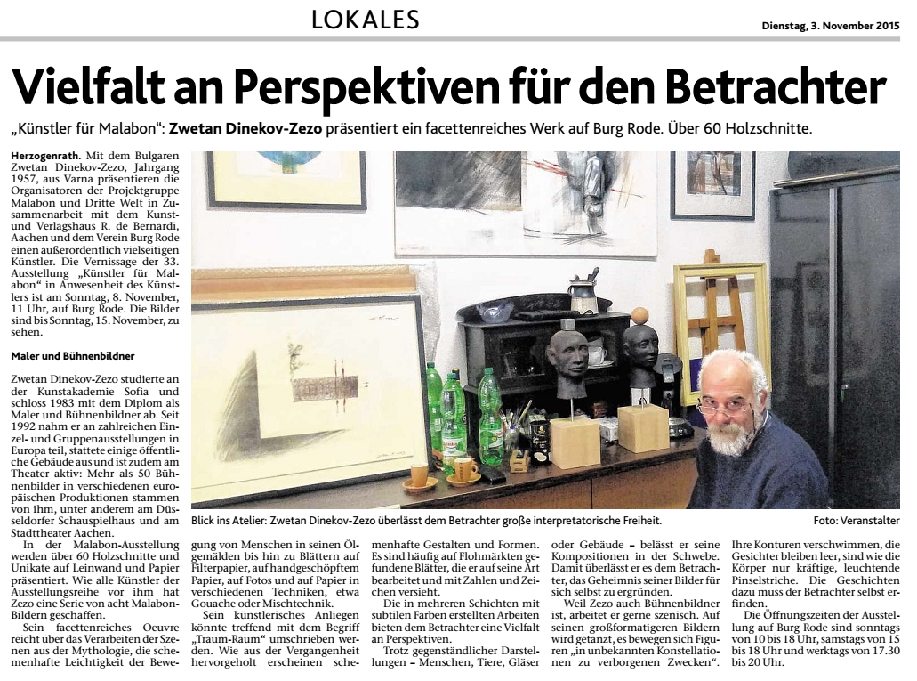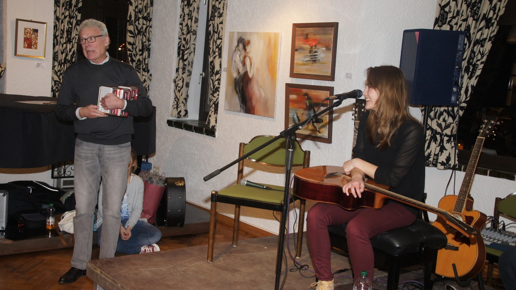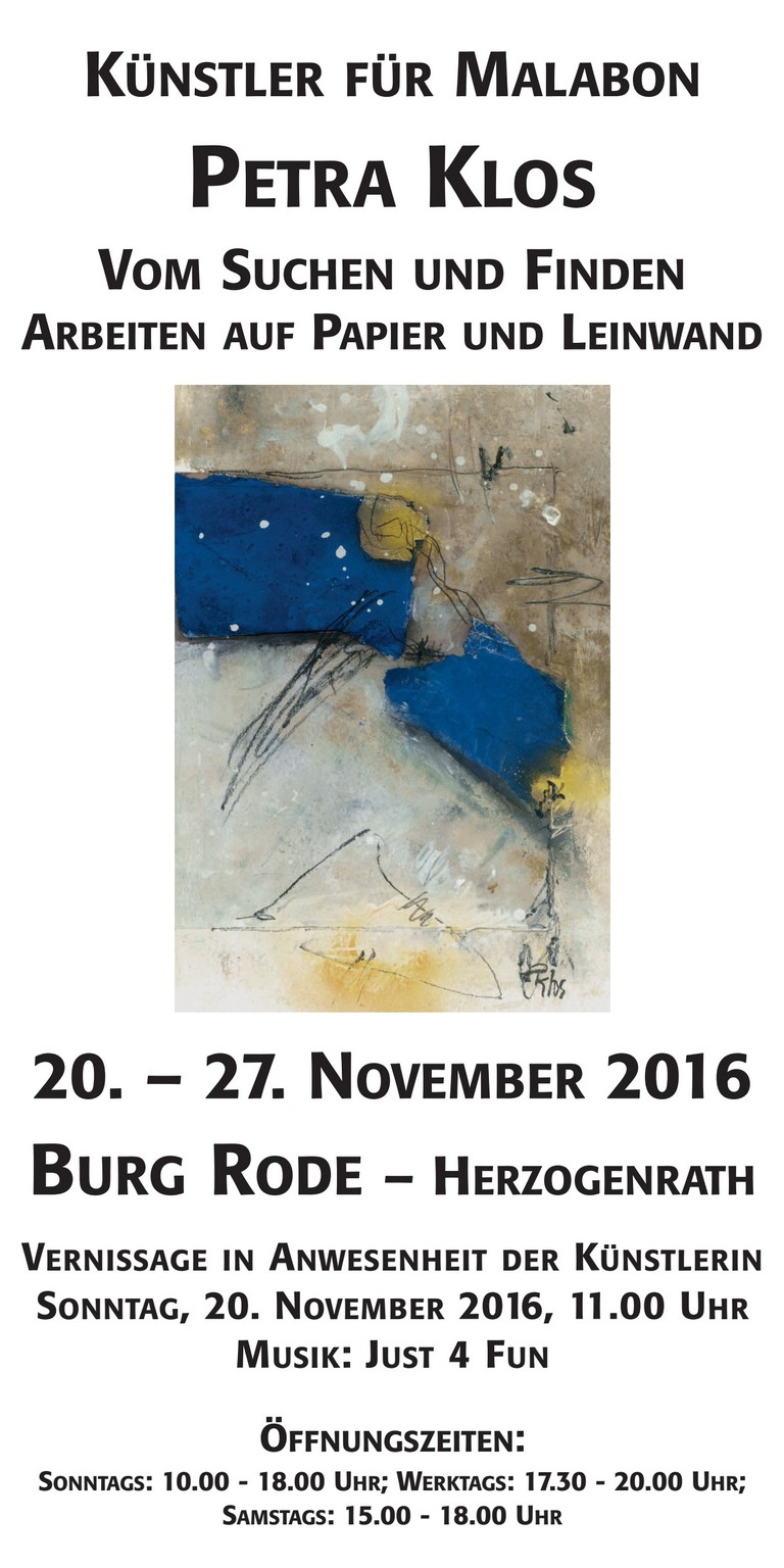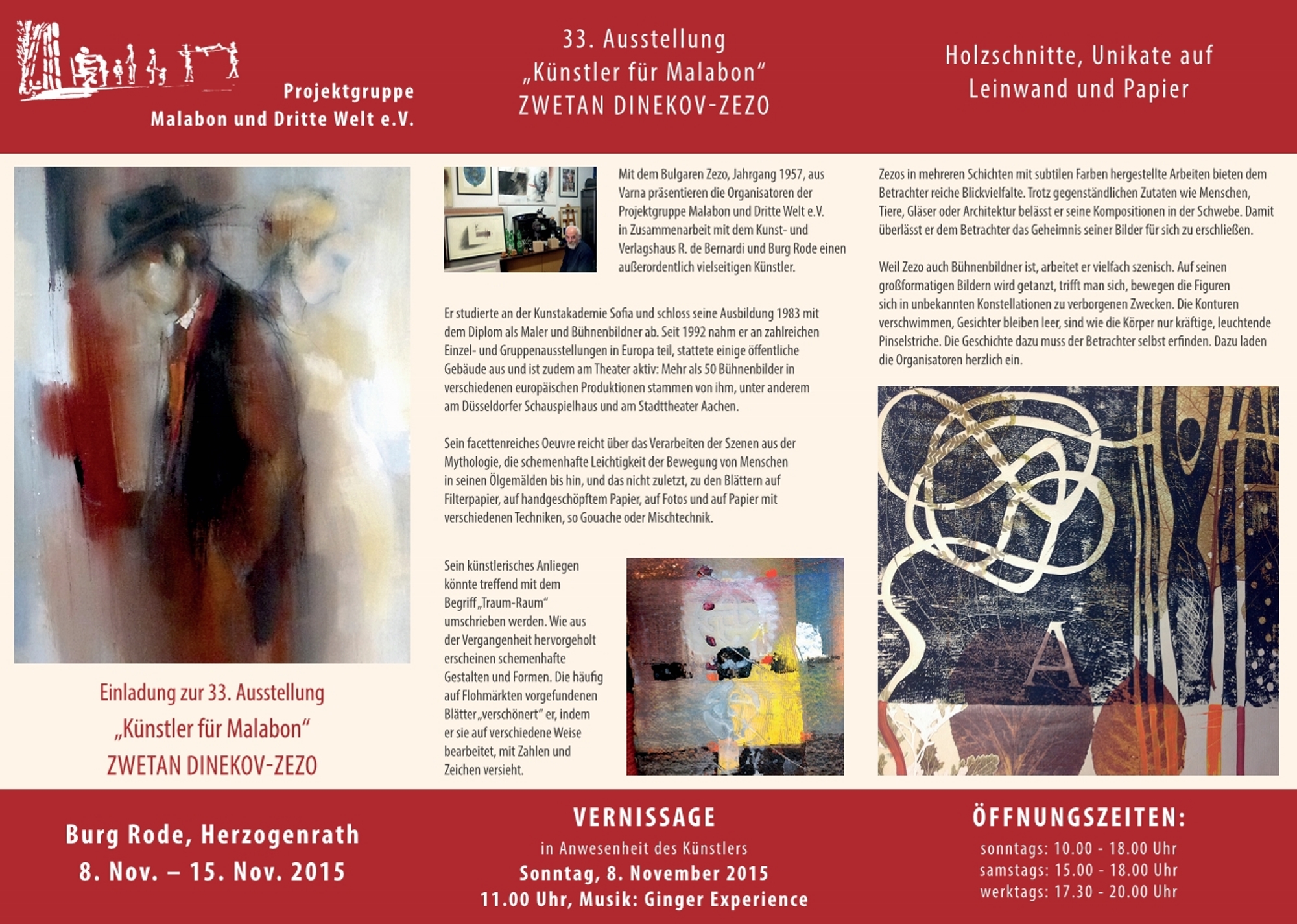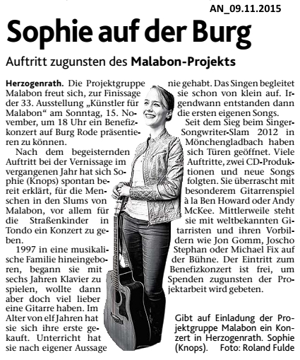 Dieter schreibt zum Konzert von Sophie:Liebe Malabonfreunde,nein, unter einem guten Stern stand die Finissage unserer 33. Ausstellung "KÜNSTLER FÜR MALABON" – Zwetan Dinekov-Zezo - wahrlich nicht. Nicht, dass die Ausstellung kein Erfolg gewesen wäre, ganz im Gegenteil! Sie war gut besucht und fand viel Anklang bei den Besuchern; und nicht ganz unwichtig für unsere Projekte, war sie auch ein finanzieller Erfolg.Die Veranstaltung stand unter dem Eindruck der schrecklichen Ereignisse von Paris, die niemanden loslies-sen. Da war die Tatsache, dass Sophie Knops unter einer Erkältung litt, die sie zwang, das vorgesehene Programm ein wenig einzukürzen, noch das kleinere Übel.Mit ihren überwiegend selbst komponierten und getexteten Liedern, gleichermaßen gekonnt wie auch stim-mungsvoll vorgetragen, hatte sie einen Weg gefunden, der der besonderen Situation in jeder Hinsicht ge-recht wurde. Begeisterter Applaus zwischen den Stücken, noch gesteigert am Ende des Konzerts, spiegelte die Stimmung der Besucher wider. Dazu trugen auch Sophies Mutter Irene (Gesang) und Tim am Cajón bei, die die Sängerin von Zeit zu Zeit begleiteten. Und den Bitten um eine Zugabe, von den Zuhörern ersehnt, widersetzte sich Sophie nicht; nein, es wurden gleich mehrere daraus. Es war nicht zu übersehen, dass dieser Auftritt im heimeligen Ambiente der Burg Rode bei Wein und Kerzenschein auch Sophie großen Spaß bereitet hatte.Da war es fast schon zu erwarten, dass Herbert Schmerz, der sich bei Sophie und ihren Mitstreitern für diesen wunderbaren Spätnachmittag herzlichst bedankte, den Wunsch äußerte, dass Sophie doch im näch-sten Jahr wiederkommen möge.