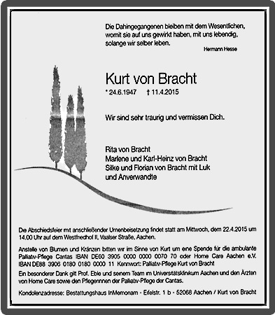 in den letzten Tagen erreichte uns die Nachricht vom plötzlichen Tod unseres langjährigen Freunds Kurt von Bracht. Wir sind tief bestürzt und sehr, sehr traurig.