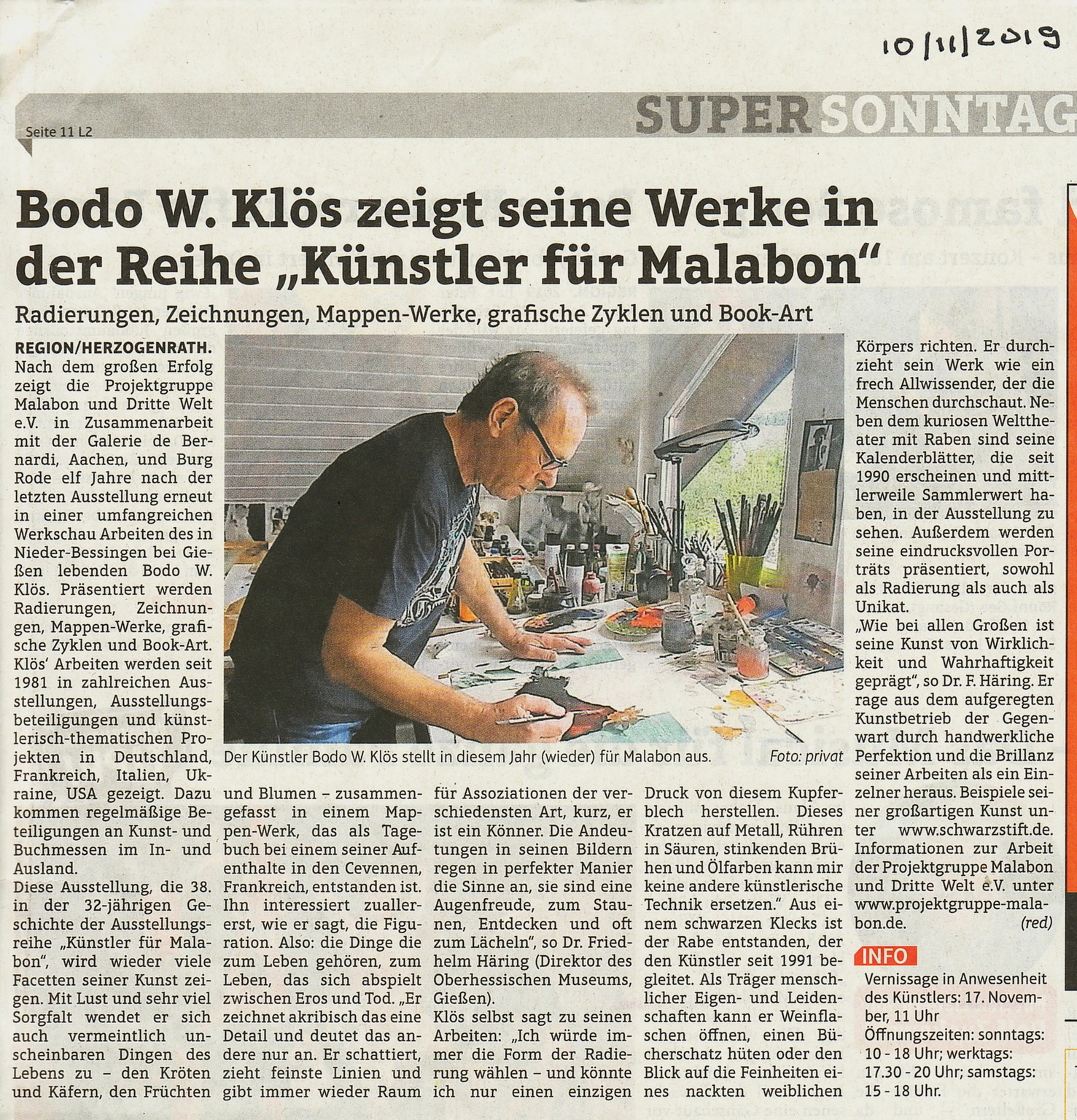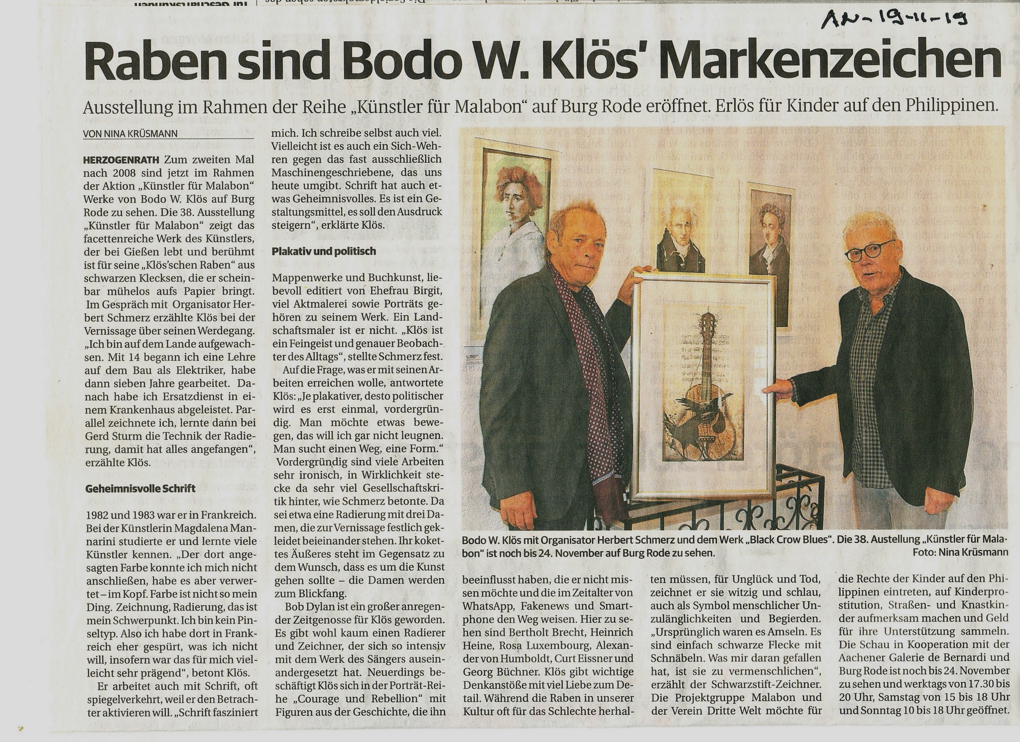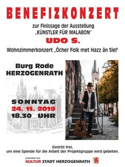 ÖCHER FOLK MET HAZZ ÄN SIELUdo S, Öcher Leddcheremaacher met Jitar än CajonDie Projektgruppe Malabon und Dritte Welt e.V. freut sich zur Finissage der 38. Ausstellung „Künstler für Malabon“ zusammen mit dem Kulturamt der Stadt Herzogenrath und Burg Rode ein Benefizkonzert der besonde-ren Art auf Burg Rode präsentieren zu können.Udo S ist der Name des „im Exil“ (Herzogenrath) lebende Aachener Mundart-Liedermachers Udo Schroll, der selbst geschriebene/komponierte Lieder in Aachener Mundart singt und spielt. „Öcher Platt“ anders geht nicht“, sagt er, ist für ihn, die bewusste Auseinandersetzung und Pflege des Aachener Dialekts unter weit gehender Vermeidung von „Kölnizis-men“ oder anderen Platteinflüssen.Seit Ende 2012 widmet sich Udo S. verstärkt dem Lieder-Schreiben in seiner Muttersprache, dem „Öcher Platt“. In seinen Liedern geht es vor allem um das „Heij än Jetz“. Sie beschreiben Lebensgefühl und Gedanken aus dem gegenwärtigen Alltag des „Hier und Jetzt“, welche in zahlreichen Motiven musikalisch verarbeitet werden. Es geht um Themen, die die Menschen einfach immer beschäftigen, es geht, wie so oft, um „Liebe“, aber auch um „Freiheit“ (persönliche wie auch politische), um die „lieben Mitmenschen“, um die Möglichkei-ten, mit den „Widrigkeiten des täglichen Lebens“ (Stolpersteine) umzugehen, wie auch „um unsere „Moddere-sproech“ (Muttersprache) bzw. auch um uns Öcher im Allgemeinen.“Die verwendeten musikalischen Stile beinhalten Country-/Folk-/Blues-/Rock- wie auch Pop-Elemente, bis hin zu moderneren Singer-/Songwriter-Einflüssen. Genau verorten lässt sich sein Musikstil nicht, die einen sagen es ist Öcher Country-Folk oder kurz „AIX-Folk. Er selber sagt „es sind „die jet anger Leddchere op Öcher Platt (etwas anderen Lieder auf Öcher Platt) met Hazz än Siel“ (mit Herz und Seele). Aber eigentlich ist die genaue Verortung des musikalischen Genres nicht so wichtig, denn wer Udo S. einmal gehört hat, weiß worum es geht: Lieder auf Öcher Platt aus dem „Heij än Jetz“ (Hier und Jetzt).Dieses Wohnzimmerkonzert ist eine Premiere seiner neuen Lieder, die deutlich gegenwartsbezogener und zeitkritischer sind als bisher. Er singt und spielt auf der Bass-Cajaon sitzend und mit einem Sizzle Board, dazu die Akustikgitarre.Die Projektgruppe Malabon lädt alle Öcher und Nicht-Öcher und alle diejenigen, die gerne Öcher Mentalität und Sprache pflegen und kennenlernen möchten zu diesem Konzert ein, das sicherlich in den Köpfen vieler Besucher in Erinnerung bleiben wird. Es ist alters unabhängig und gerade die Gegenwartsbezogenheit der Lieder soll aber auch verstärkt jüngere Menschen anregen, sich etwas mehr mit dem Öcher Platt und viel-leicht auch mit der Arbeit der Projektgruppe Malabon auseinander zu setzen.Das Konzert findet statt am 24. Nov. 2019 um 18.30 Uhr auf Burg Rode, Herzogenrath. (Zugang zur Burg über die Burgstraße).Der Eintritt ist frei. Um eine Spende für die Arbeit der Projektgruppe wird gebeten.Liedbeispiele unter: http://www.udo-s.eu