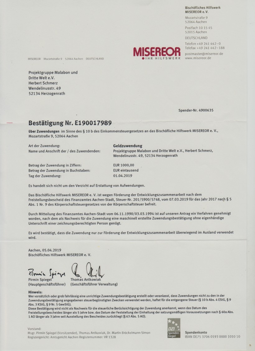 Nachdem wir aus den Medien von den fürchterlichen Aus-massen, die der Tropensturm Idai, der am 14. März zu-nächst auf die Küste Mosam-biks traf und dann seine zer-störerischen Bahnen in das Landesinnere und weiter zog, haben wir uns entschlossen, an MISEREOR 1.000€ als Katastrophenhilfe zu überweisen.Heute (9/4/2019) bekamen wir von MISEREOR nebenste-hendes Dankesschreiben und Bestätigung unserer Überwei-sung.