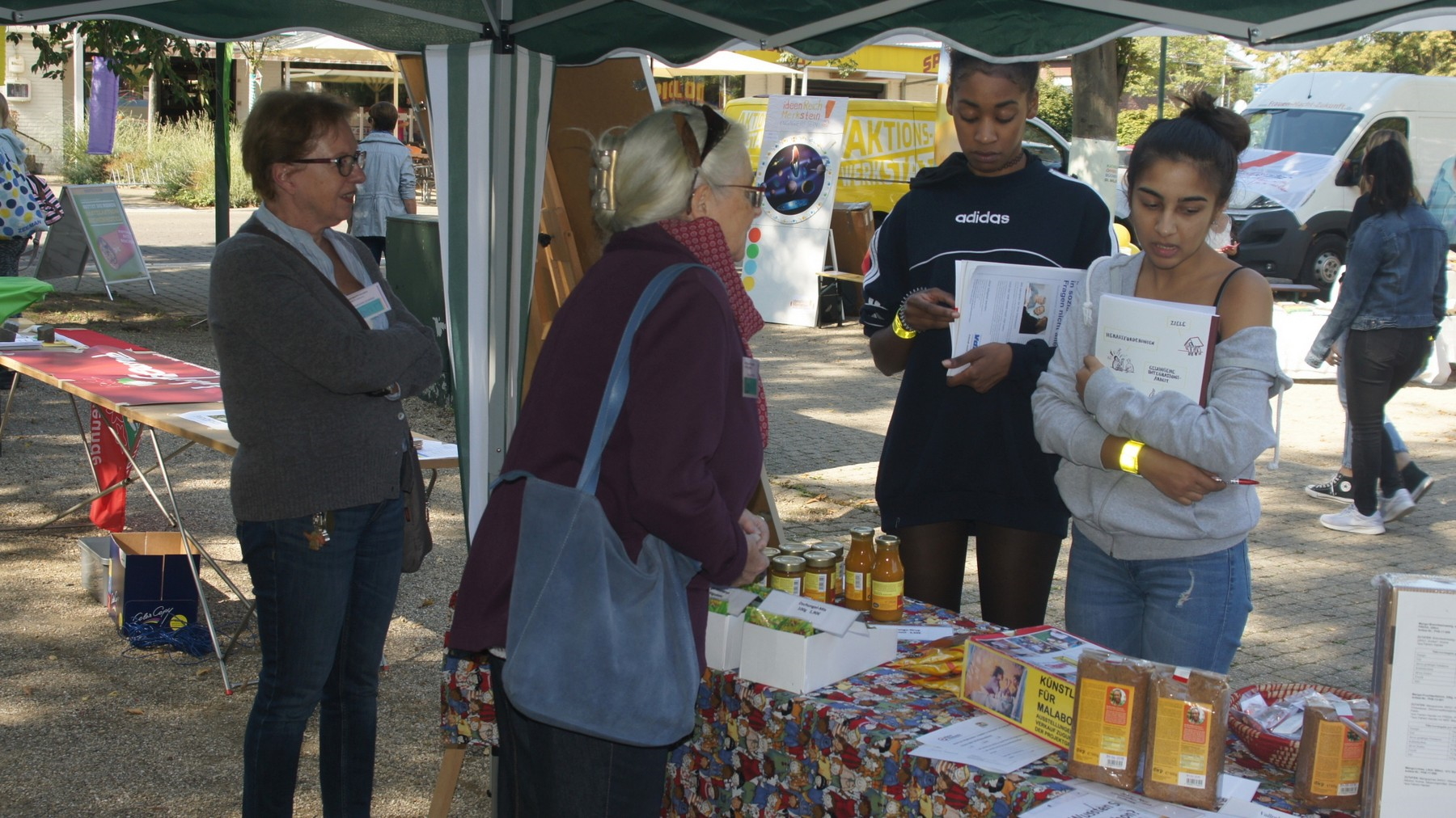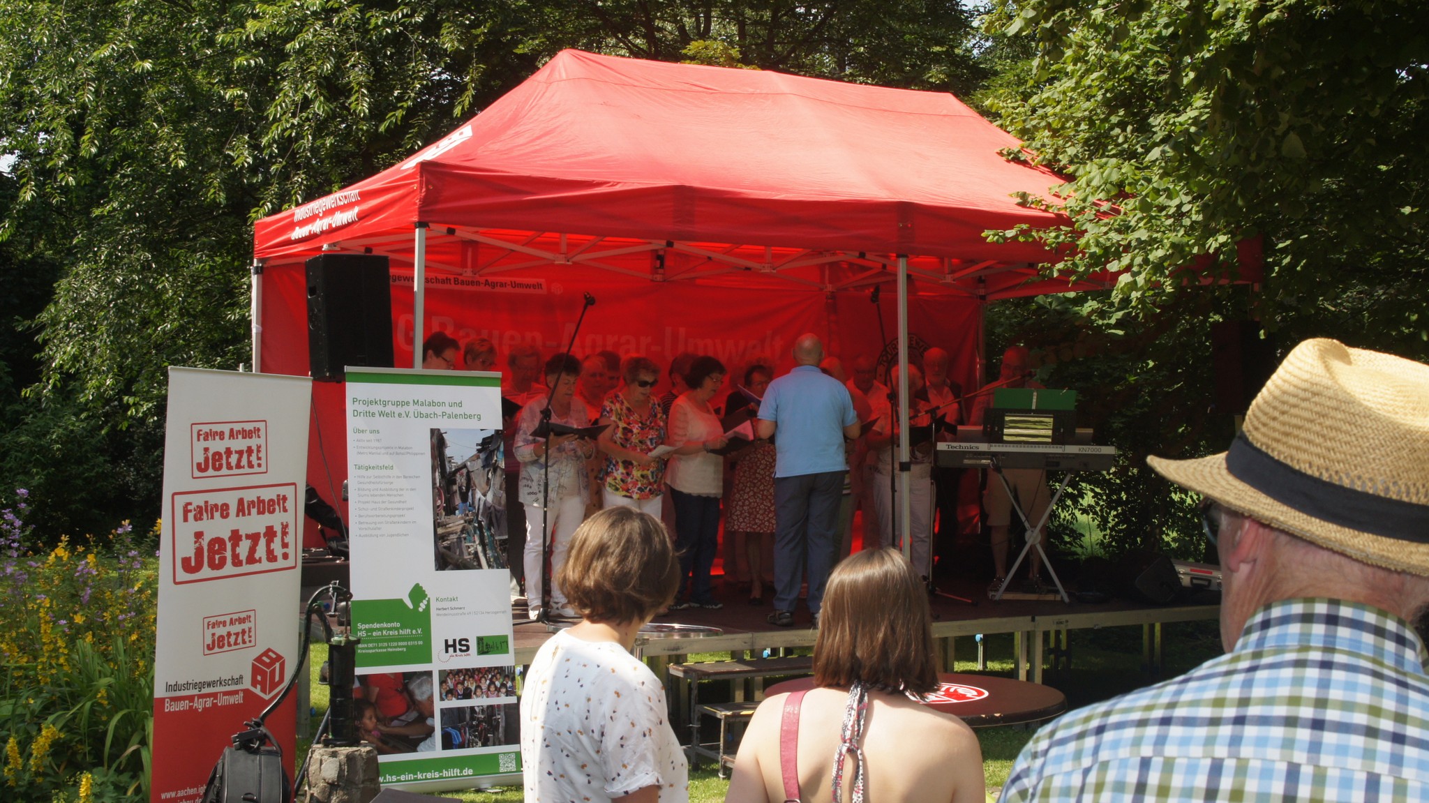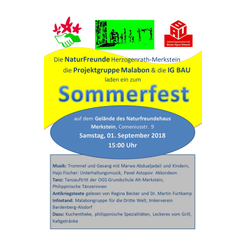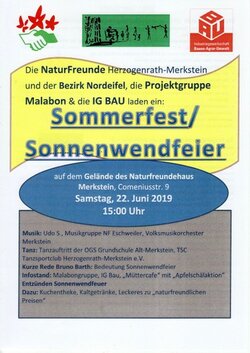 Großes Sommerfest auf dem Gelände der NaturFreunde in MerksteinAm Samstag, 22. Juni, startet um 15 Uhr das große Sommerfest auf dem Gelände der NaturFreunde (NF) Herzogenrath-Merkstein in der Comenius-straße 9 in Merkstein. In bewährter Manier wird die Veranstaltung organi-siert von den NF in Zusammenarbeit mit der „Projektgruppe Malabon und Dritte Welt e.V.“ und des Bezirks der „IG Bauen, Agrar, Umwelt“ – finanziell unterstützt von der Sparkasse Aachen. Neu ist in diesem Jahr die Einbe-ziehung der Sonnenwendfeier des NF-Bezirks in den Nachmittag/Abend. Information und Unterhaltung ist die Devise: Es gibt Infostände der „Pro-jektgruppe Malabon“ mit fair gehandelten Mangoprodukten und philippi-nischen, vegetarischen Frühlingsröllchen, der „IG Bau“ zur Gewerkschafts-arbeit; das „Mütter-Cafe“ von „moliri“ und den NF ist mit einer „Apfelschäl-aktion“ nicht nur für Kinder mit dabei. Der NF-Vorsitzende Bruno Barth er-läutert die Bedeutung der Sonnenwendfeier und es werden kleine Anerken-nungspreise verliehen für die Teilnehmer*, die bei der Eröffnungsveran-staltung zum „WasserWeg Wurm“ der NF am 19. Mai beim Quiz die richtige Lösung eingereicht haben.Das Bühnenprogramm beginnt mit einem Tanzauftritten der OGS der Grundschule Alt-Merkstein und des TSC Tanzsportclubs Herzogenrath-Merkstein e.V.. Musik ist zu hören von Udo S, der Lieder in Aachener Mundart – heiter bis kritisch – darbietet; von der Musikgruppe der NF-Eschweiler mit einer „Reise um die Welt“ und dem Volksmusikorchester Merkstein. Das Programm endet mit dem Entzünden des Sonnenwendfeuers. Und natürlich gehört zu jedem Sommerfest der NF eine Kuchentheke, Kaltgetränke und Leckeres zu „naturfreund-lichen Preisen“.Das untenstehende Foto mit dem Ankündigungsplakat zeigt v.l.n.r.: Dirk Führen (Sparkasse Aachen), Bruno Barth (NaturFreunde), Thomas Krumscheid (IG Bau) und Herbert Schmerz (Projektgruppe Malabon). (Foto: Dieter Wefers).