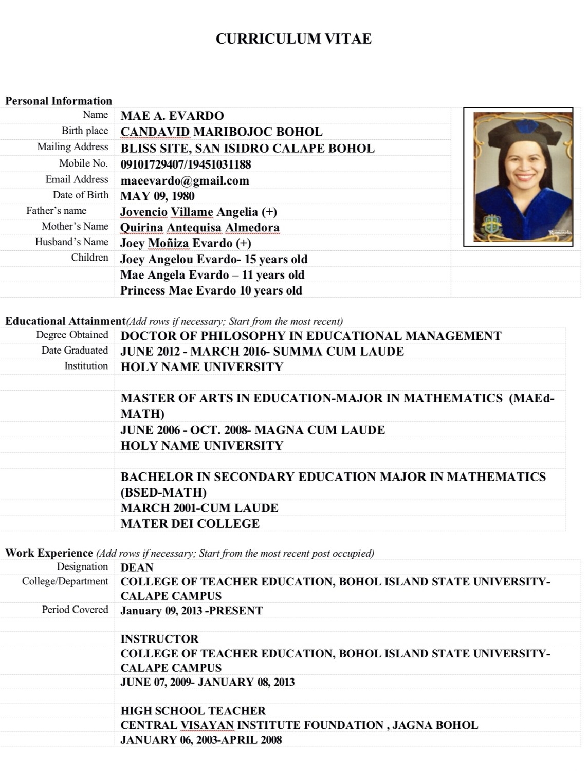 Was für eine ErfolgsstoryUnsere ehemalige Schülerin Mae, die 2002 am Mater Dei College in Tubigon graduierte, ist jetzt als Dr. Mae Angelia Evardo Dekanin am "College of Education of Bohol Island State University".Liebe Mae, im Namen der Projektgruppe Malabon und Dritte Welt e.V. "CONGRATULATION, WE ARE PROUD OF YOU AND HAPPY WITH YOU".Maligayang pagbati!Ipinagmamalaki namin ang iyong tagumpay. Umaasa lahat para sa iyong hinaharap.