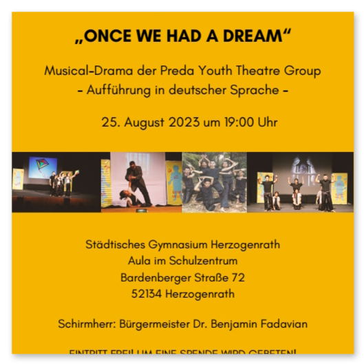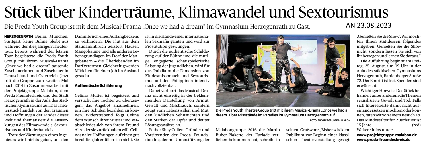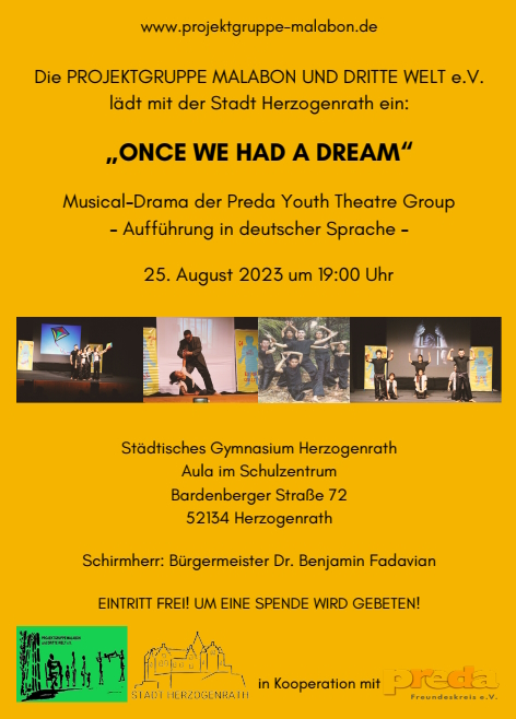 zur Aufführung des Musical-Dramas "ONCE WE HAD A DREAM" am 25.08., 19:00, in der Aula des Städt. Gymnasi-ums. (Einzelheiten weiter unten).Zu unserer großen Freude hat Fr. Shay Cullen, sein Kommen angekündigt.