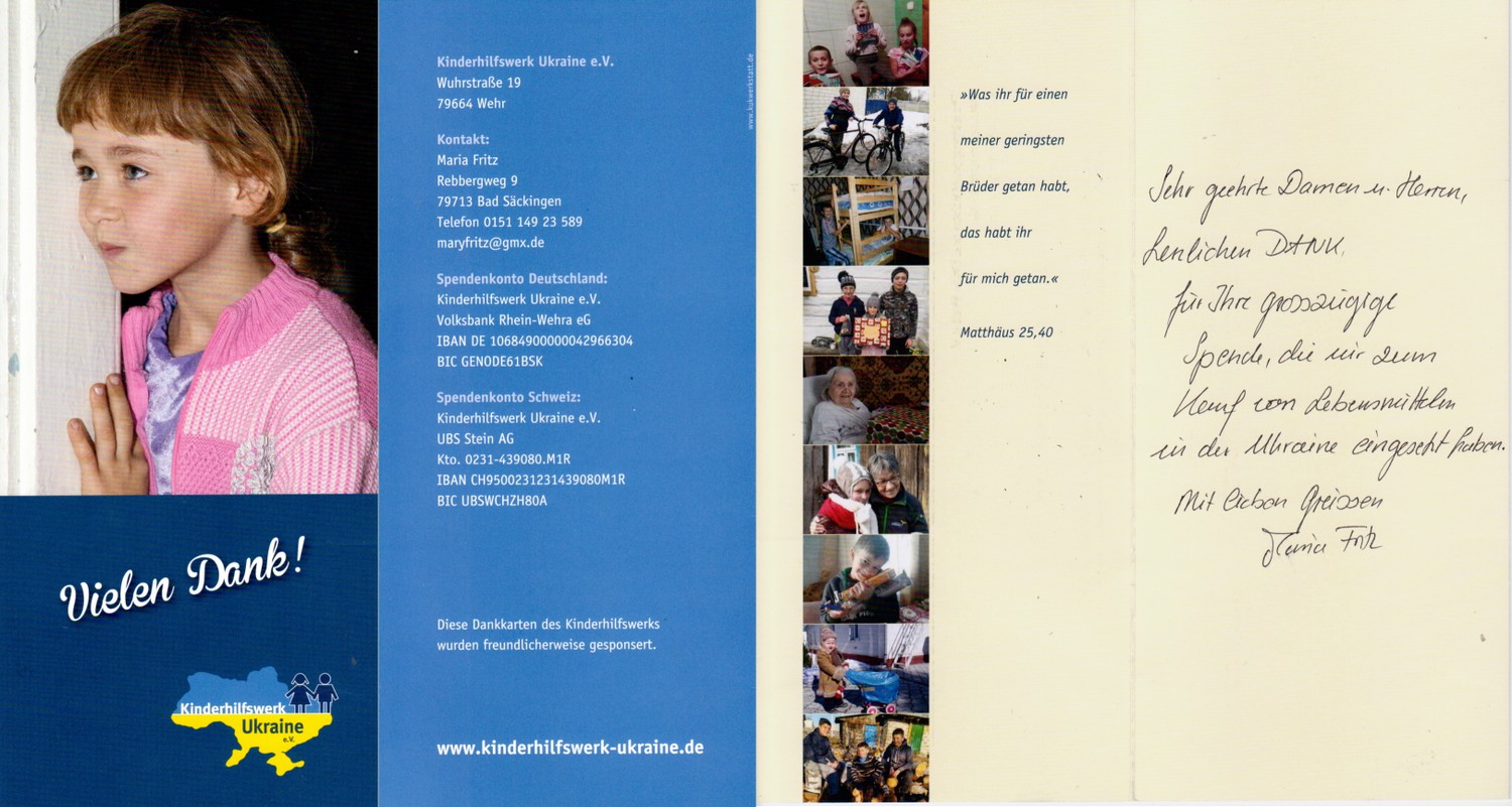 Aufgrund der schrecklichen Bilder und Berichte aus der Ukraine haben wir beschlos-sen, in Absprache mit Father Boy, das "Kinderhilfs-werk Ukraine e.V." mit 1.500€ zu unterstützen.(re. die Dankeskarte des Hilfswerks)