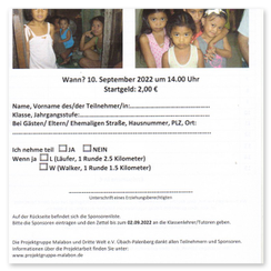 Hier das vorläufige Endergebnis: 21.567,00 EUUntenstehend ein Foto der Scheckübergabe durch die Schülersprecherin Maxime de Laat und den Schüler-sprecher Frederick Haßler sowie ein paar Impressionen vom Lauf. Selbst der neue Schulleiter Michael Höbig ließ es sich nicht nehmen, am Lauf teilzunehmen.