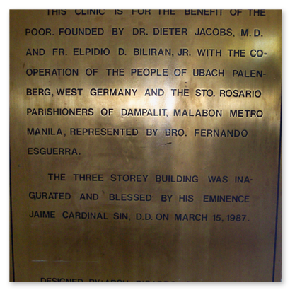 Bereits am 15. März 1988 (der Eintrag auf der Messingplatte ist leider falsch) konnte das Haus der Gesundheit (in Malabon "Free Clinic" genannt) von dem damaligen Kardinal Sin geweiht werden.