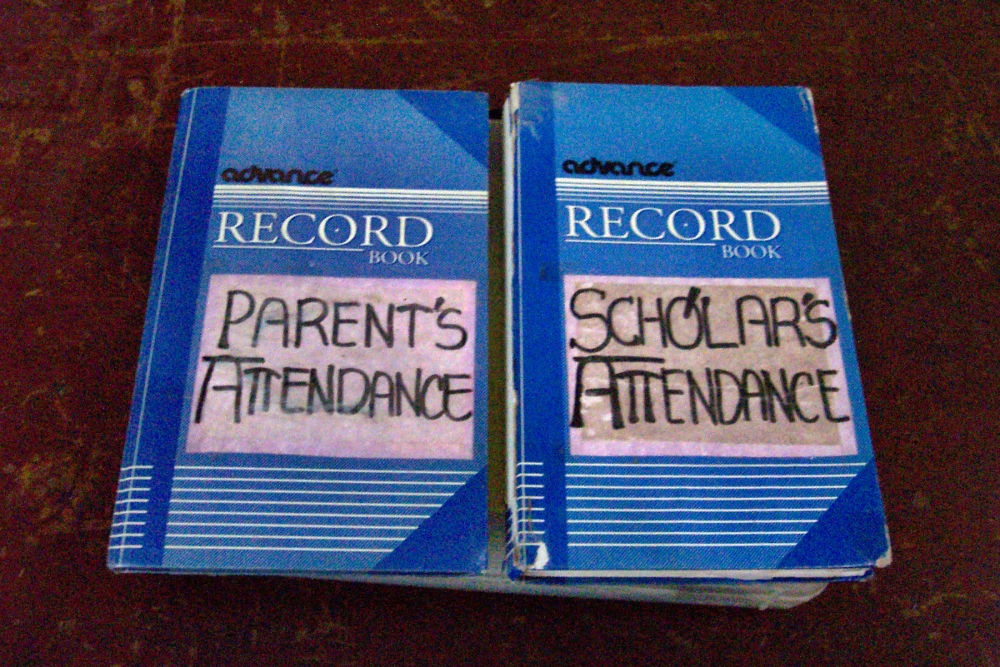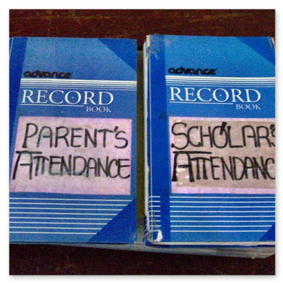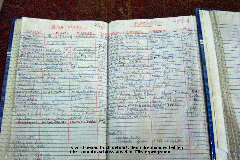 Bei den sonntäglichen Treffen tragen sich Eltern und Scholars in das Anwesenheitsbuch ein.Dreimaliges unentschuldigtes Fehlen bedeutet Ausschluss aus dem Förderprogramm.
