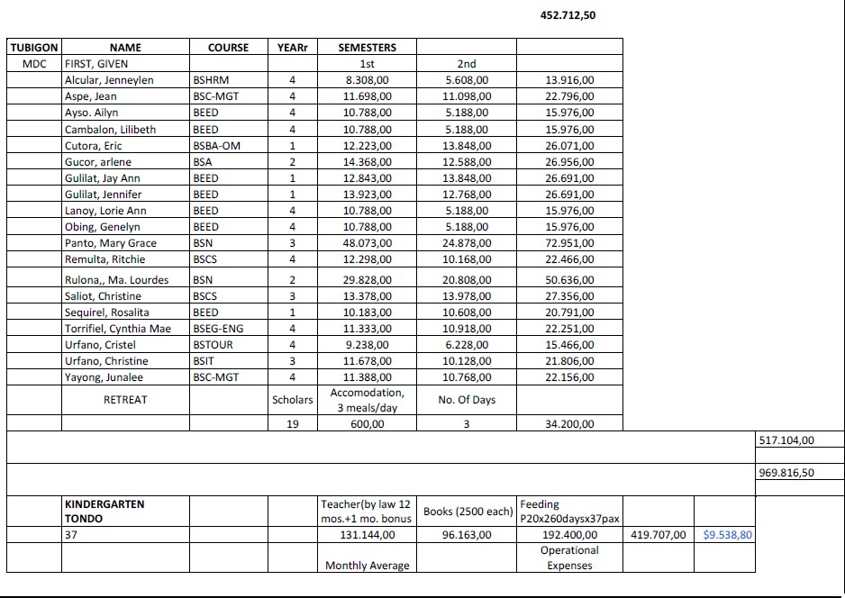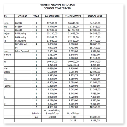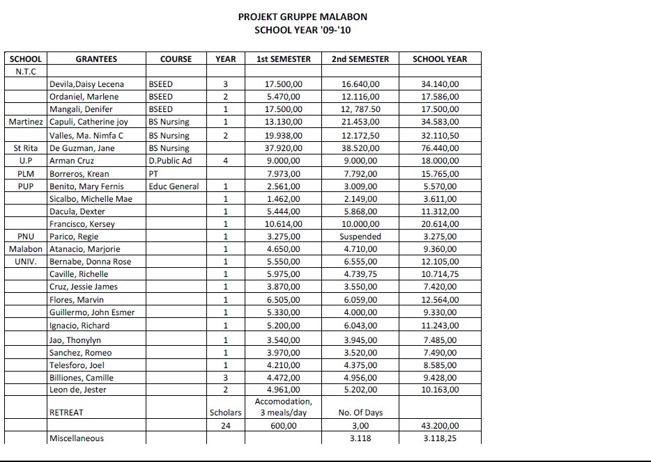 Von den Spenden aus unserer Region geht ein großer Teil in die beiden Schulprojekte in Malabon und auf der Insel Bohol (ca. 9.500 US$ im Schuljahr 2016/2017). Z.Zt. (Schuljahr 2013/2014) bezahlen wir 10 Begabten in Malabon die Kosten für die College-Ausbildung. Diese verpflichten sich, nachdem sie ein Einkommen haben, das Schulgeld für ihre Geschwister zu zahlen.Damit trägt sich diese Hilfe weiter