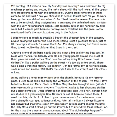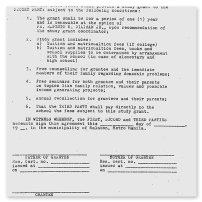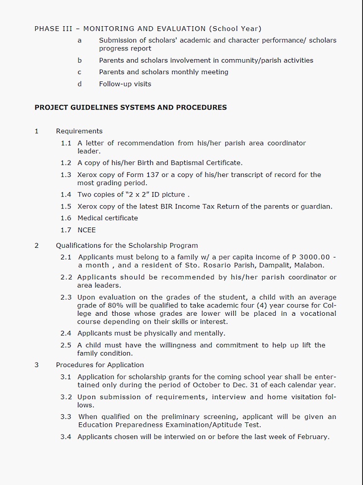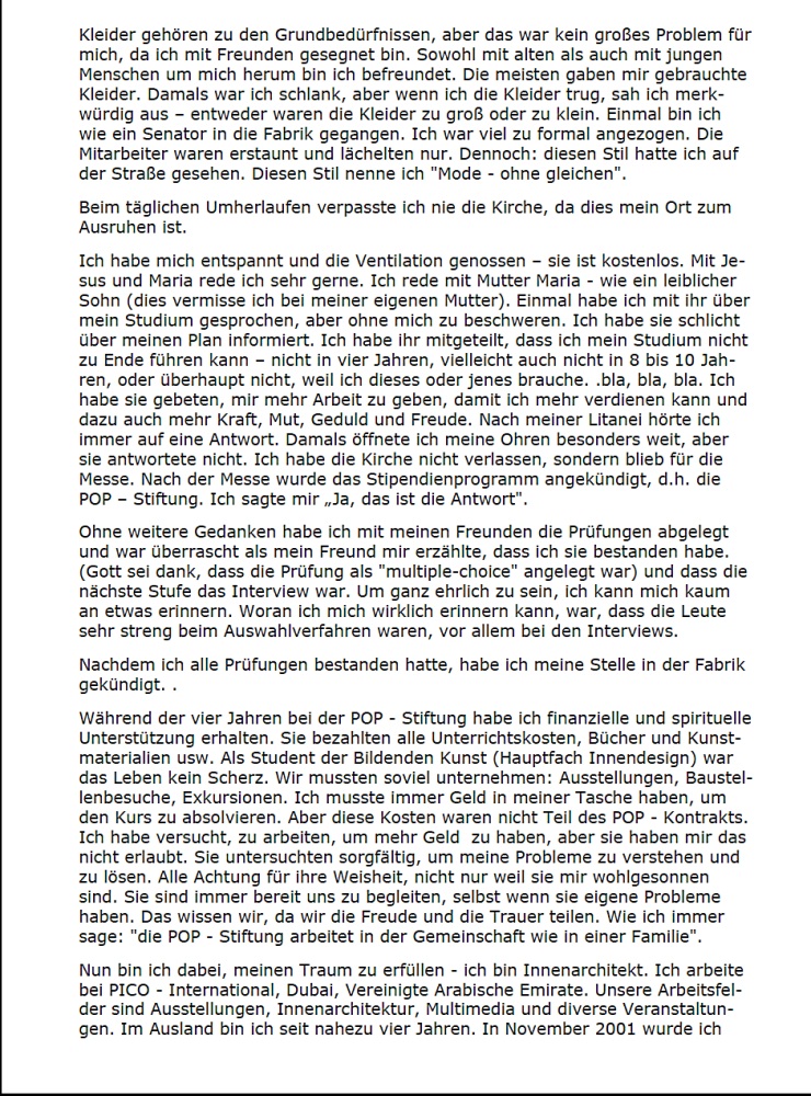 3. Zahlung: Zwischenprüfungen4. Zahlung: AbschlussprüfungMit der Aufstellung der Finanzberichte bestätigt Father Boy die Kenntnisnahme der Studiengebühren und ihre Auszahlung.Dieses Verfahren ist üblich bei allen Stipendien auf den Philippinen.