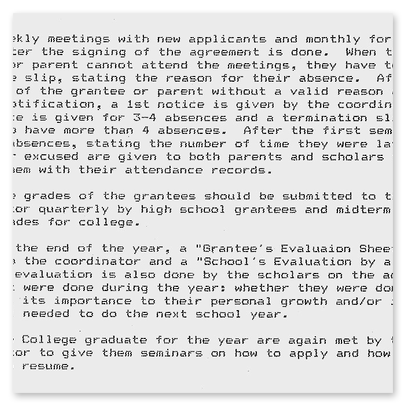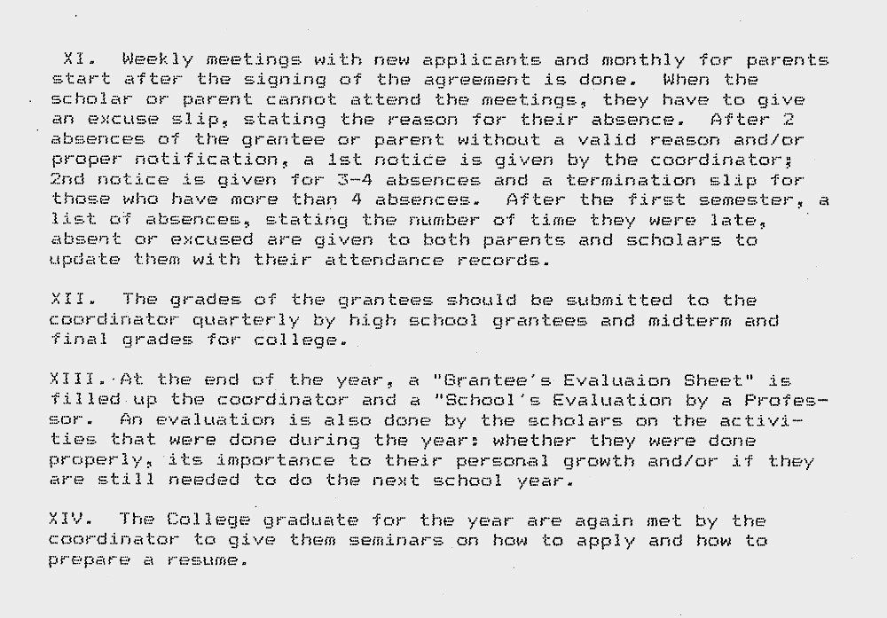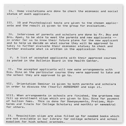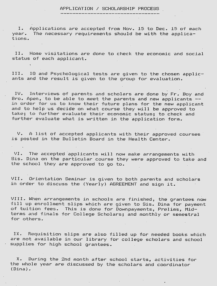 1988 hat Father Boy ein detailliertes Konzept für un-ser Schulprogramm erarbeitet, das zeigt unter wel-chen Voraussetzungen die Scholars aufgenommen werden und welche begleitenden Maßnahmen durch-geführt werden, um eine ganzheitliche Ausbildung zu gewährleisten.Wir hatten zu Beginn noch Grundschüler und High School Scholars in unserem Projekt (s. POP Grant). Diese Ausbildung wurde aber nicht weiter verfolgt, weil sie staatlich und bezüglich der Schulgebühren kostenlos ist. Dagegen ist eine College-Ausbildung, die auf einen speziellen Beruf ausgerichtet ist, mit Kosten verbunden, die die Eltern unserer Scholars nicht aufbringen können.