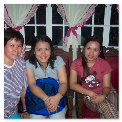 Zwei weitere ErfolgsstoriesEhemalige Scholar Hiyas Pangyarihan (li.), jetzt leitende Angestellte bei der "Central Bank of Philip-pines" und Charie Siochi (re.), jetzt Buchhalterin beim Schiffsservice im Hafen von Manila, hier zu-sammen mit Sis. Dina (2004)