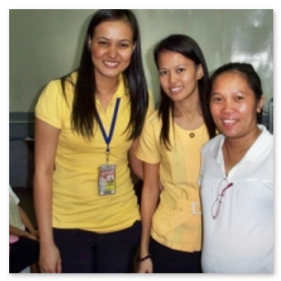 Joy Tagloban (re.) mit zwei Helferinnen, die sie wäh-rend ihrer Schwangerschaft unterstützen, (von li. Jamaica Francisco, Buchhalterin, Aiza Sison, Lehrerin. Beide arbeiten ebenfalls in Fr. Boys Schule.).Joy unterrichtete seit 2003 ca. 40 Straßenkinder in zwei Schichten in Tondo. Seit dem Schuljahr 2013/2014 kümmert sie sich am Wochenende um 60 Straßenkinder, indem sie ihnen Nachhilfe in Englisch und Mathematik gibt.