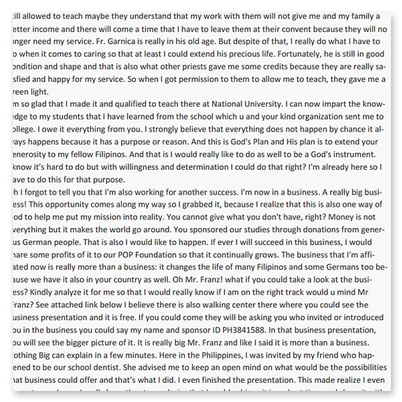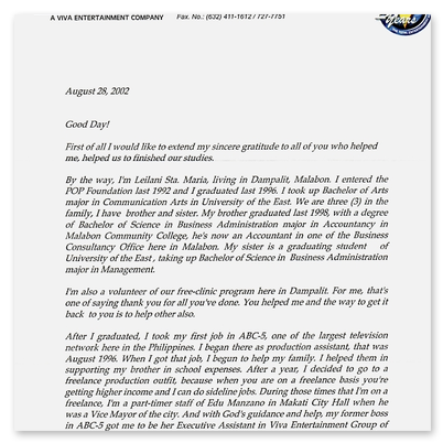 Anfang September 2002 erreichte uns der neben-stehende Brief unserer ehemaligen Schülerin Leilani Maria-Santos, der zeigt, wie Hilfe-zur-Selbsthilfe in unserem Schulprojekt funktioniert.