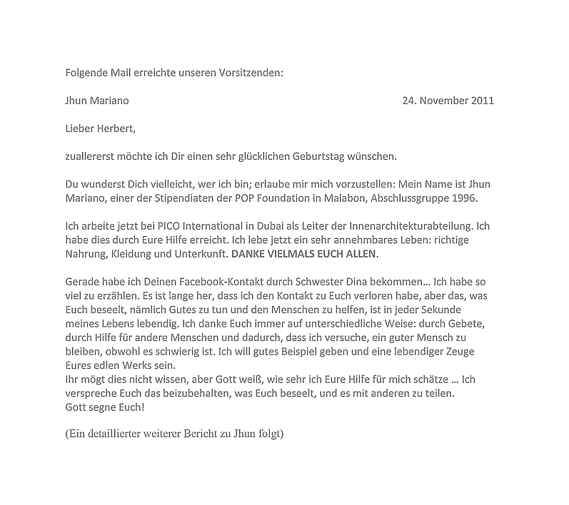Unser Mitglied Franz Flüggen erhielt im Januar 2011 nebenstehenden Brief unseres ehemaligen Schülers Daniel Juan (hier zusammen mit Franz und Father Garnica (82), den er neben seinem Beruf als Lehrer an der privaten National University, Manila, betreut).